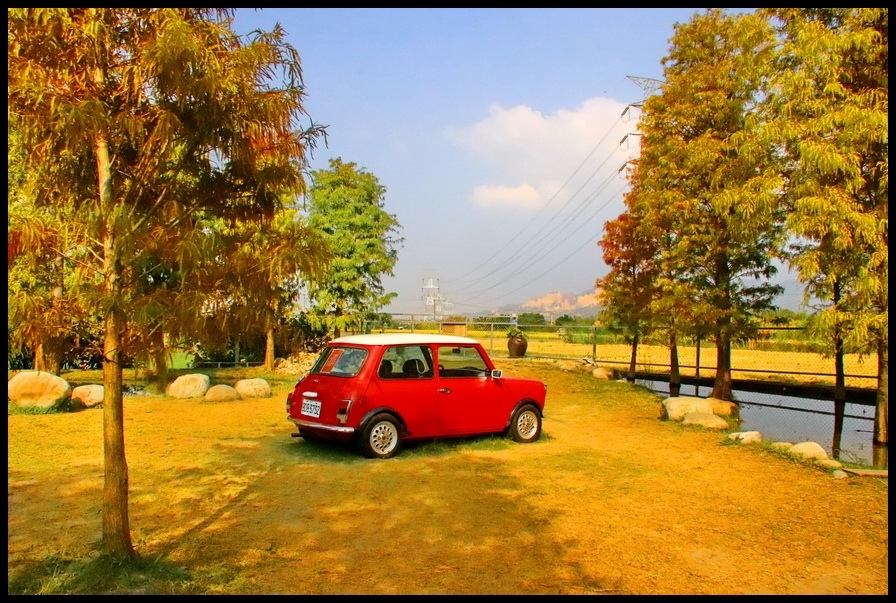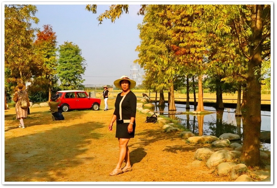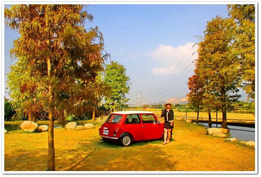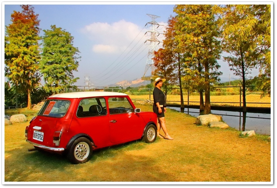 第四區塊為最新的造景,草地上擺放著一部紅色Austin Mini骨董車,有點像是歐風的感覺,這畫面也太美了,背景就是落羽松,意境十足,玩著拍著,讓人停不住按快門的手