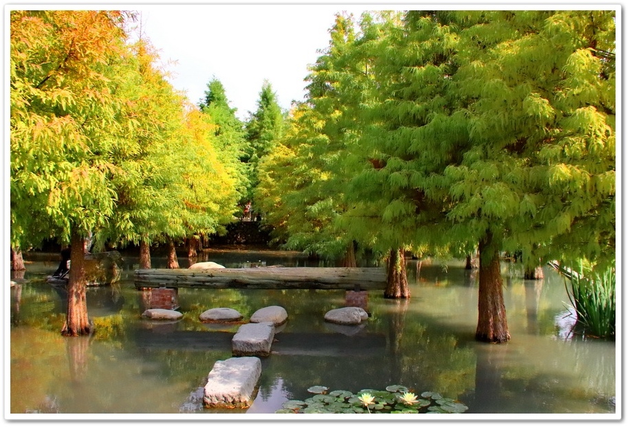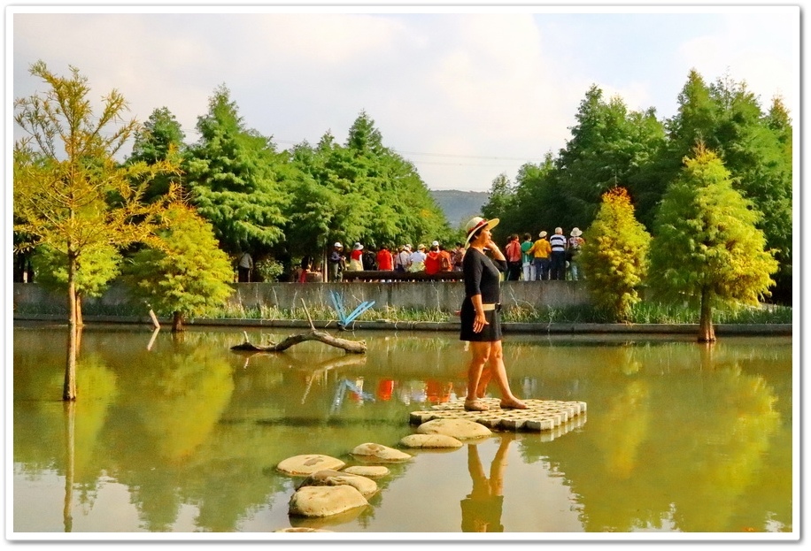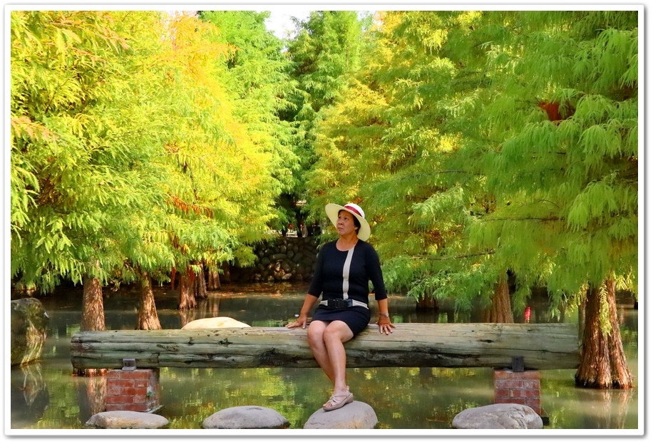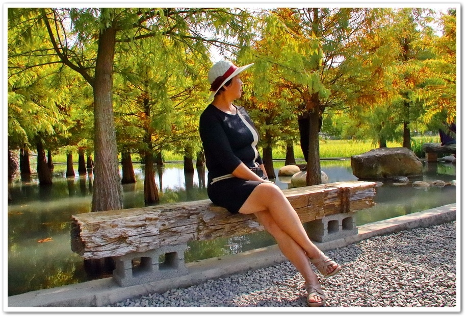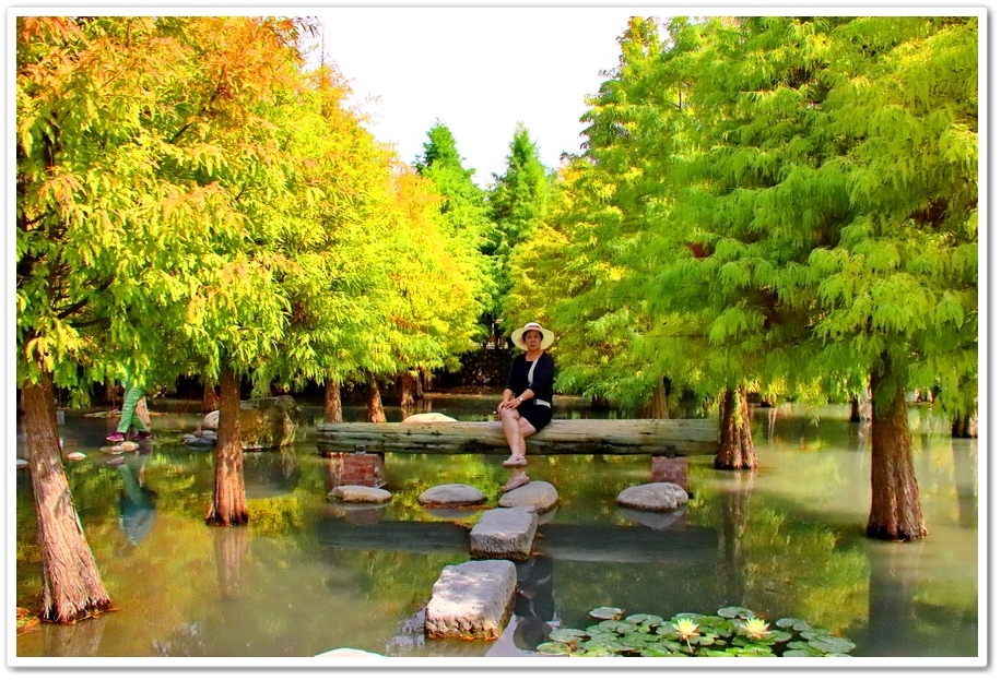 還有水中排列著石頭,可讓遊客走進去,坐在長型木頭上拍照,兩旁依偎著落羽松,拍起來非常美,又有水中倒影效果,難怪成為大家爭相拍照的重點