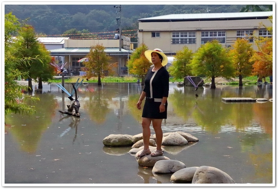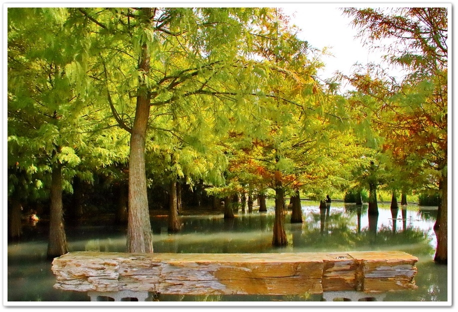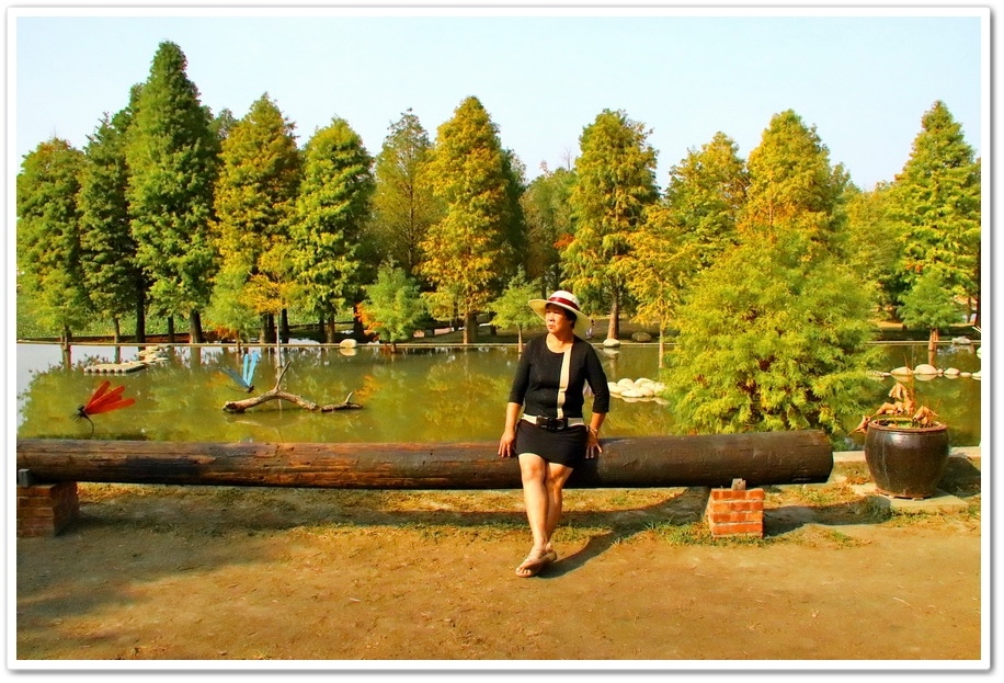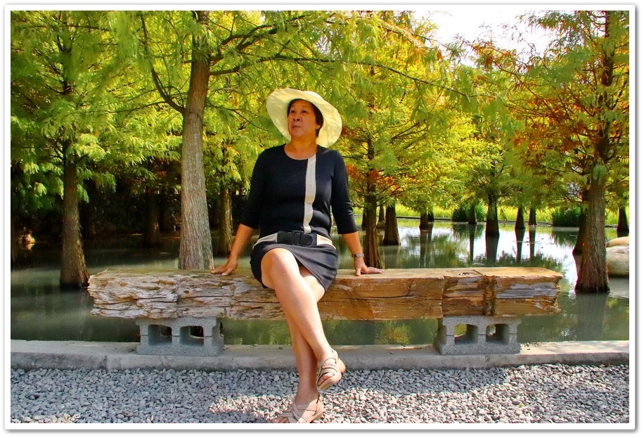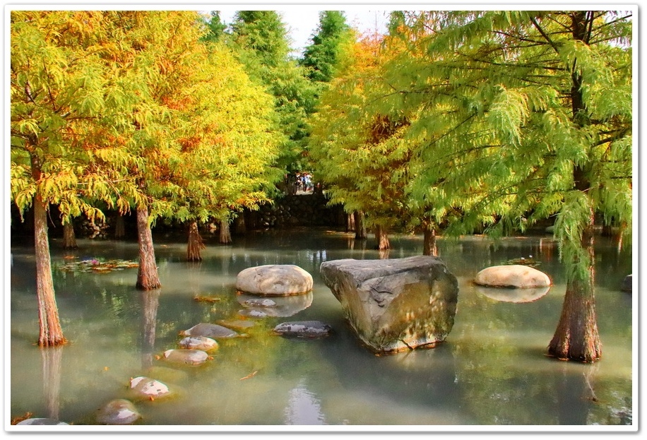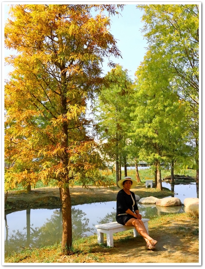還有水中排列著石頭,可讓遊客走進去,坐在長型木頭上拍照,兩旁依偎著落羽松,拍起來非常美,又有水中倒影效果,難怪成為大家爭相拍照的重點