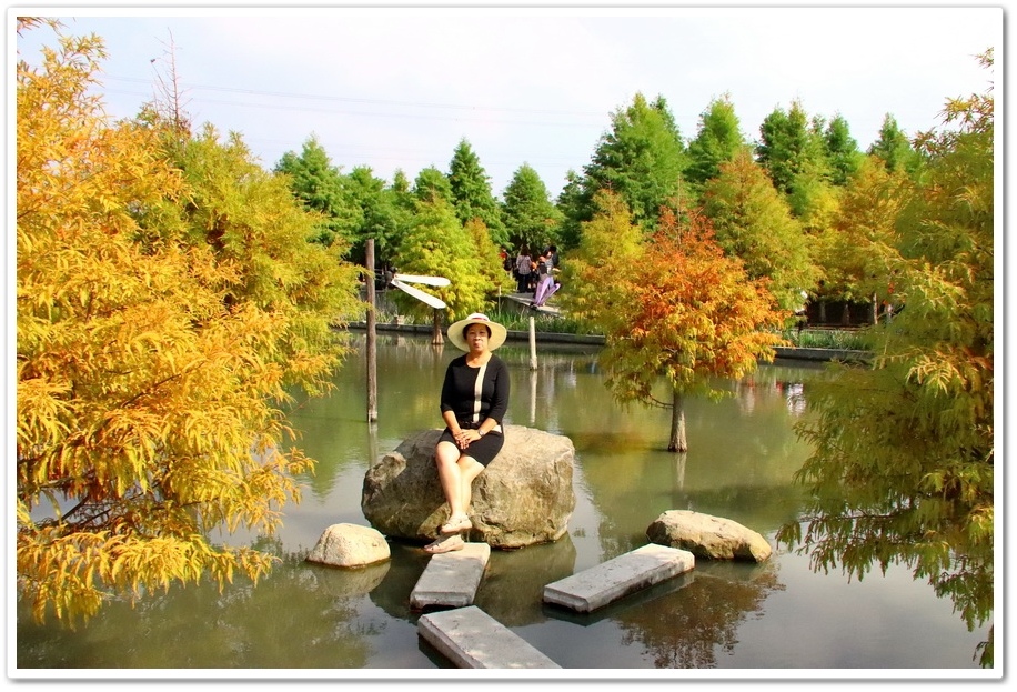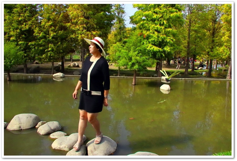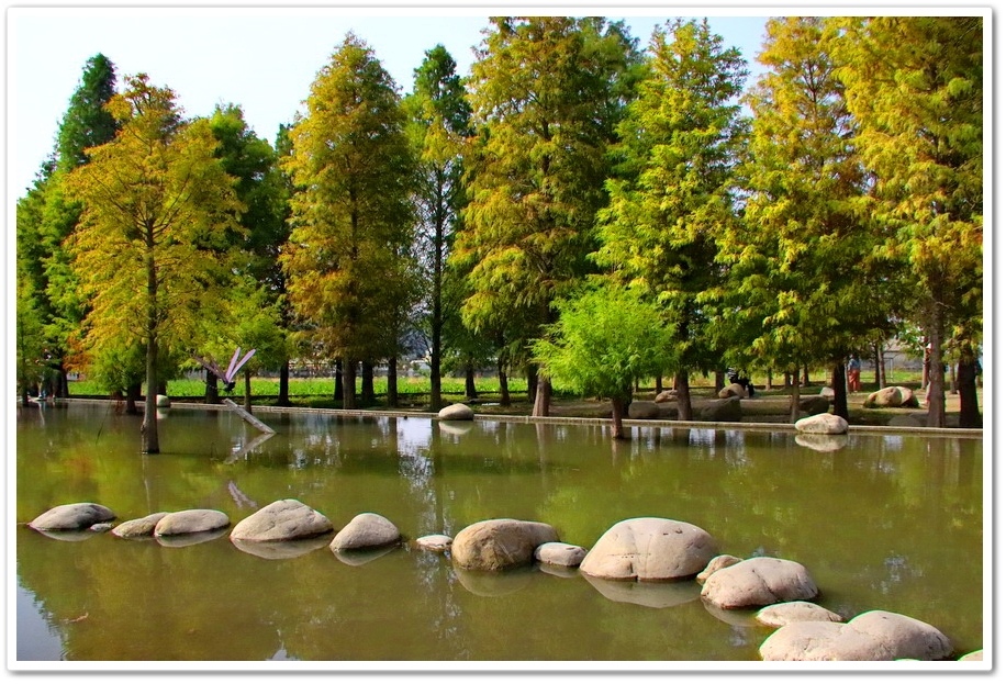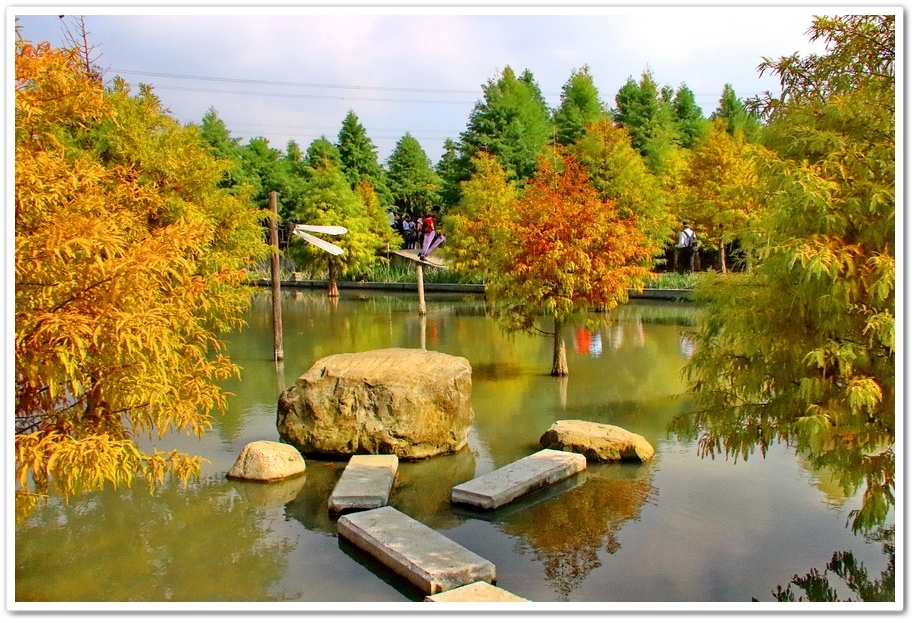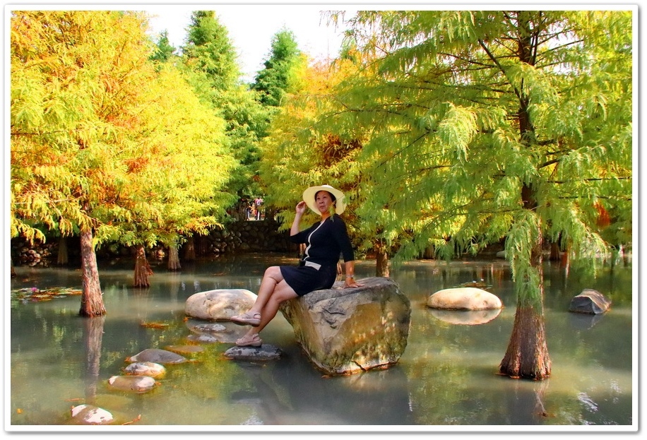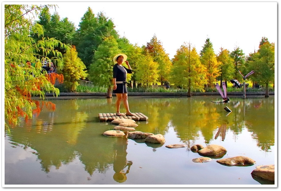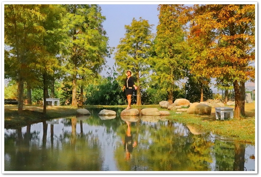 玩拍『泰安羽粼落羽松』,你會發現園區有很多水上步道,雖說都是用大石頭所排列組成,有點不好行走,但不得不說,踩在石頭上取景,畫面更夢幻動人,但取景時,一定要特別注意安全唷!