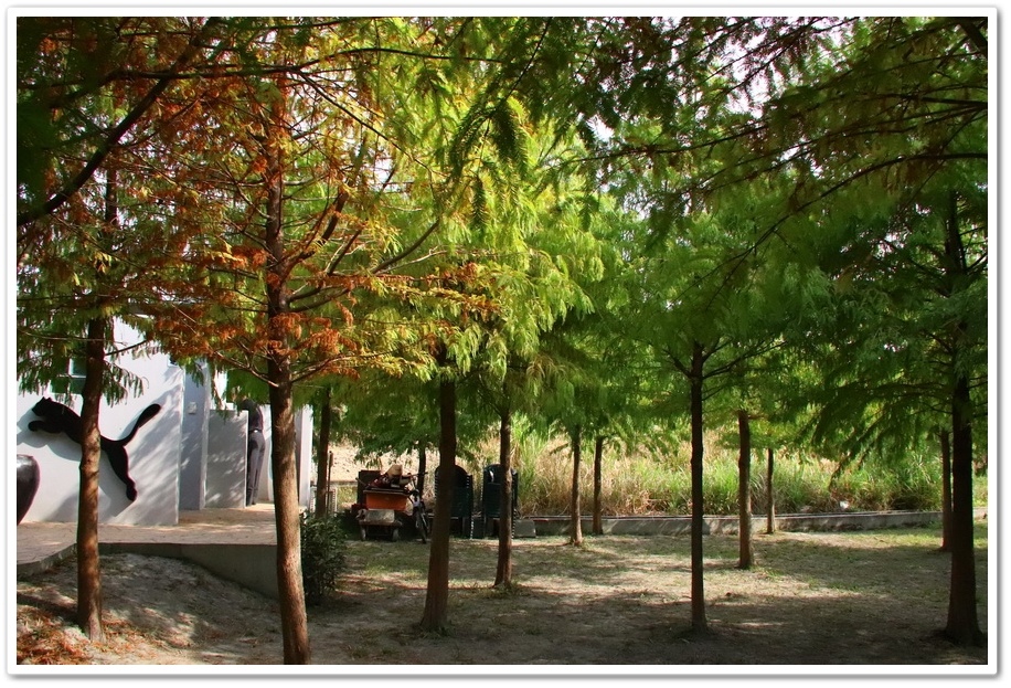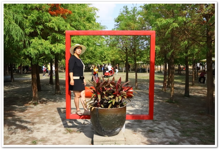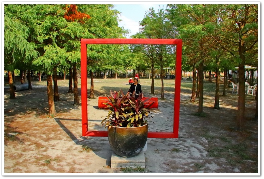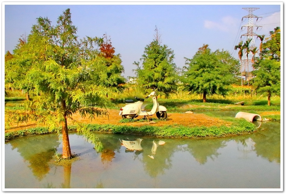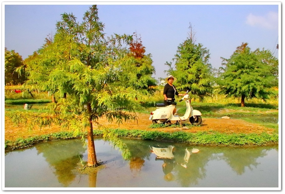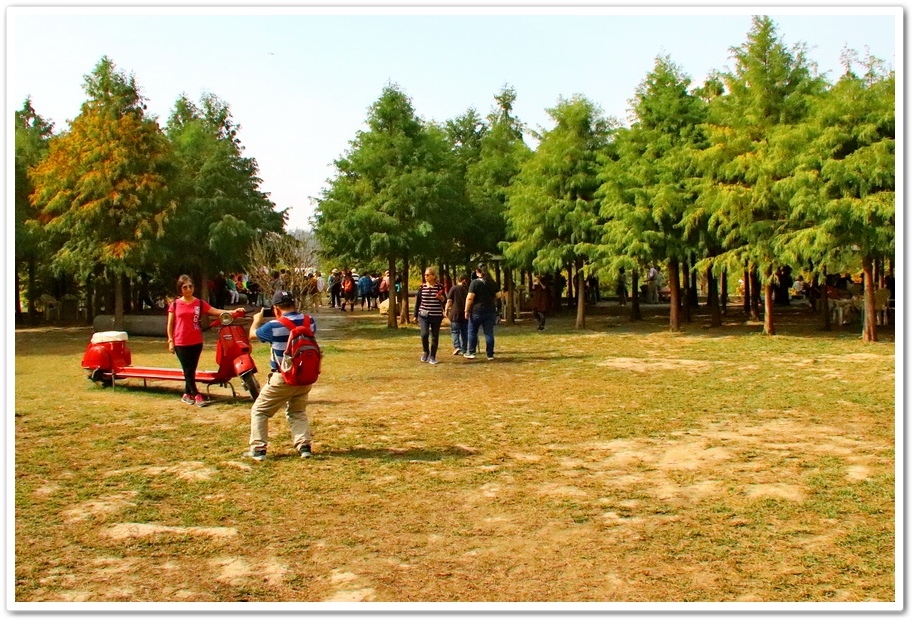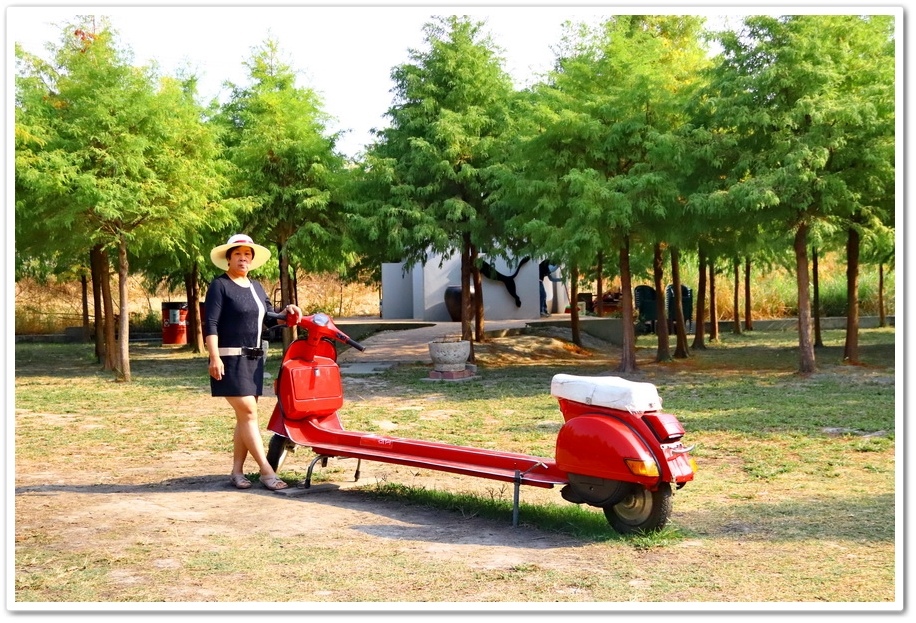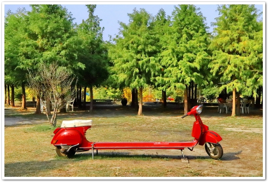 第二區塊則是種植成圓型狀的茂密落羽松森林,空曠的中間,擺放著一輛紅色加長型的偉士牌機車造型,一樣也是大家拍照的重點