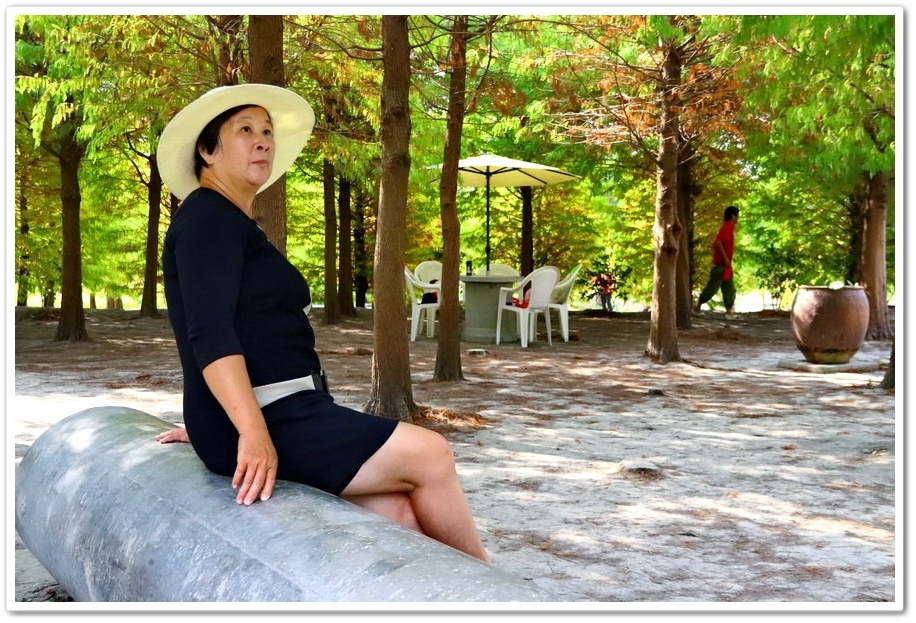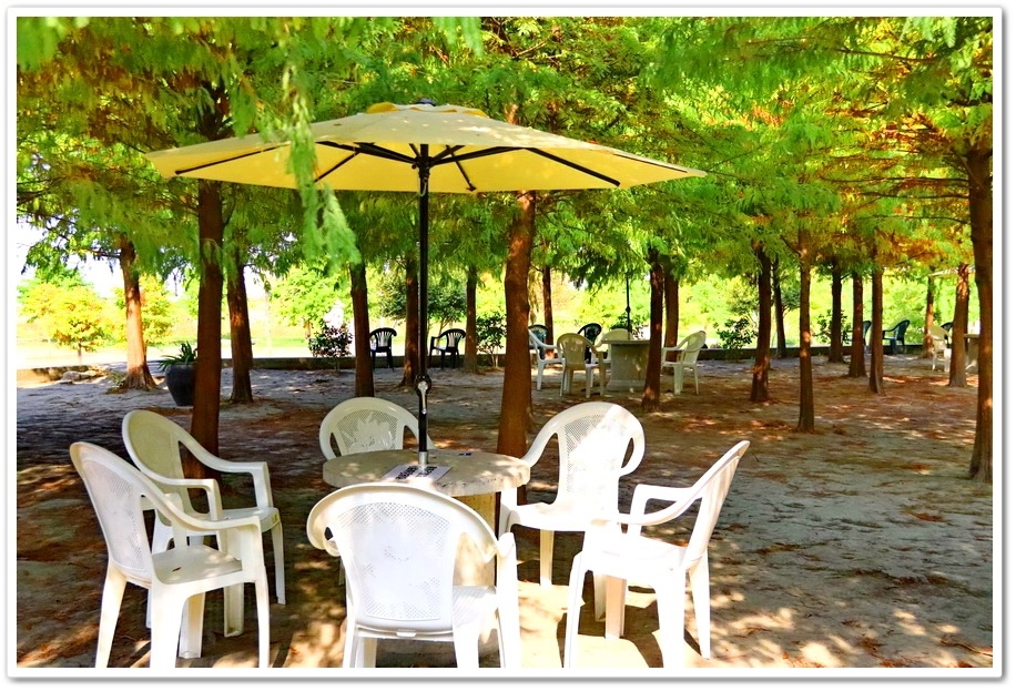 茂密落羽松森林內擺放許多白色咖啡座椅,可供遊客拍照之用,但因園區可攜帶外食入內,很多人就在白色咖啡座椅上泡茶聊天,卻成為拍照的一大障礙,拍起來沒有幽幽森林的感覺,倒反而像夜市一樣的不堪