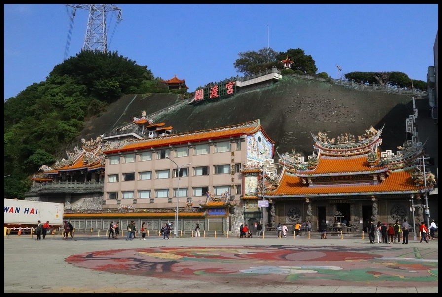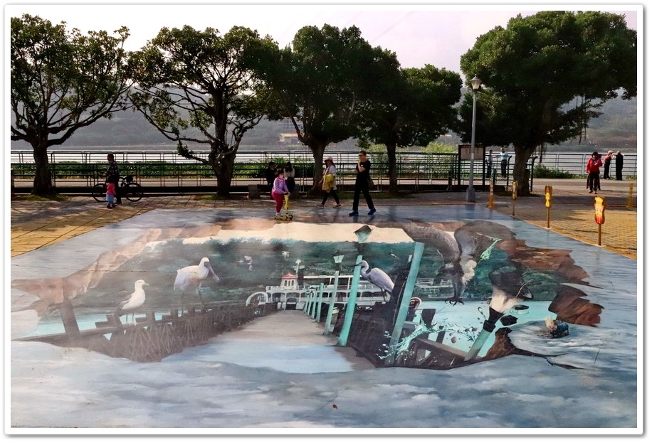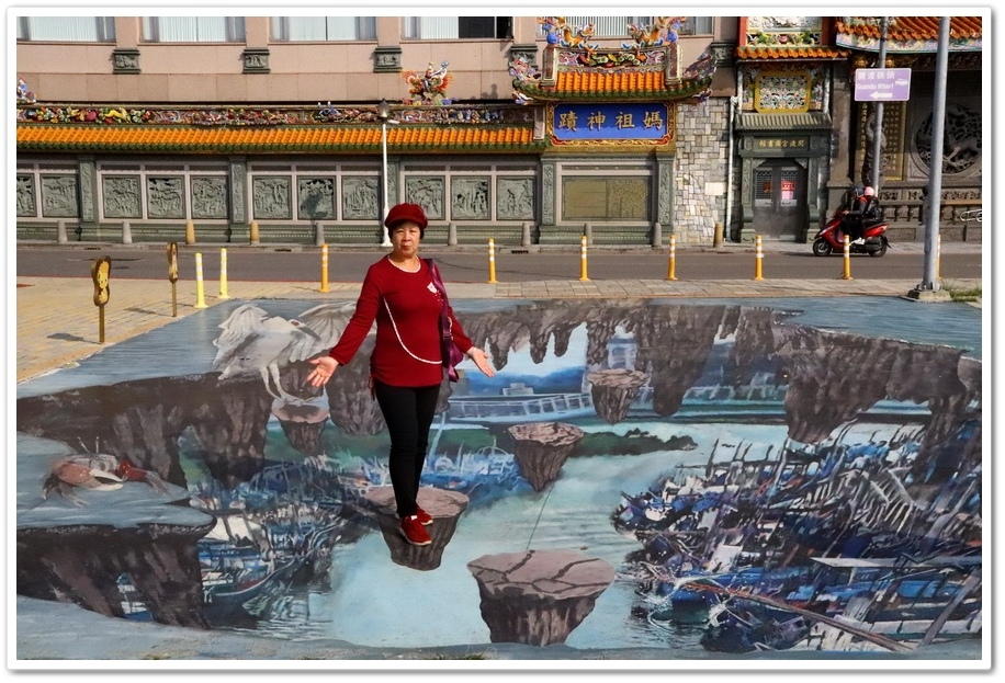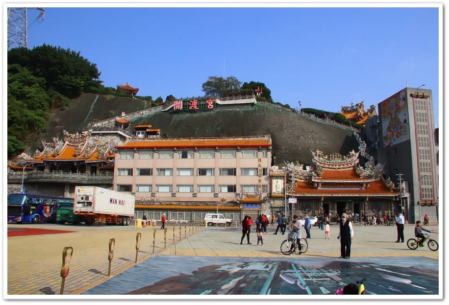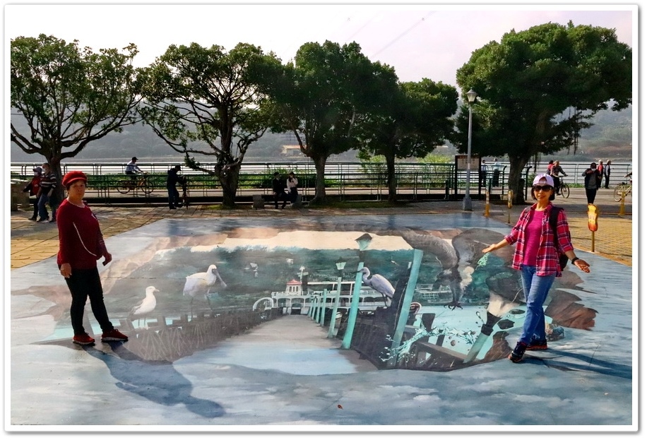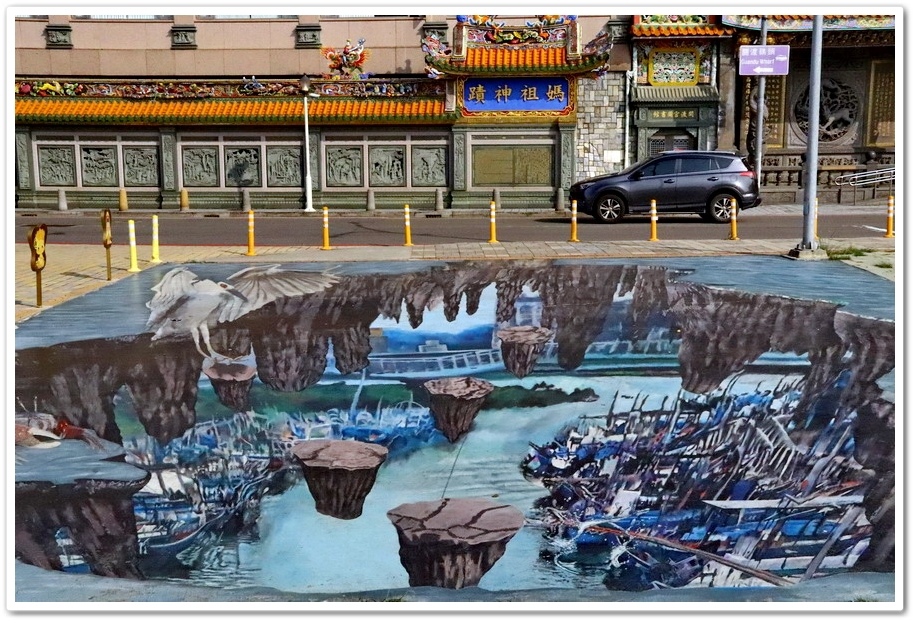 『關渡宮』廟前廣場則有3D彩繪地景,假日人潮絡繹不絕,廣場上的兩幅大型圖案採用3D繪圖,非常逼真,也成為去『關渡宮』打卡的最佳拍照點