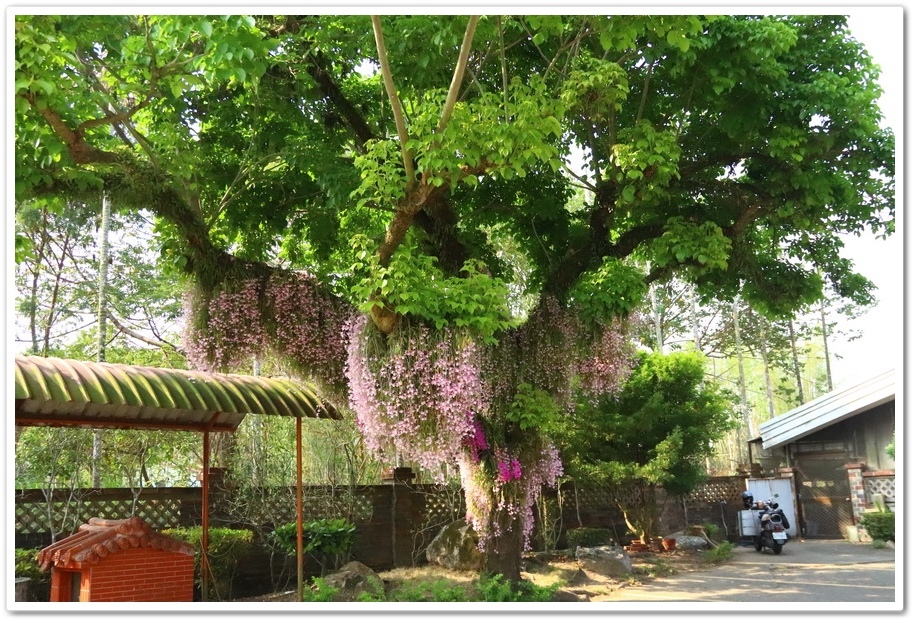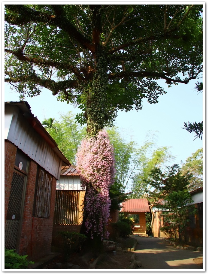 停好車!越過鄉村小路就是餐廳的大門,這時就會看到左手邊有一棵很高大的茄苳樹,樹上掛滿了『天宮石斛蘭』,萬朵粉色石斛蘭花瀑布超壯觀!