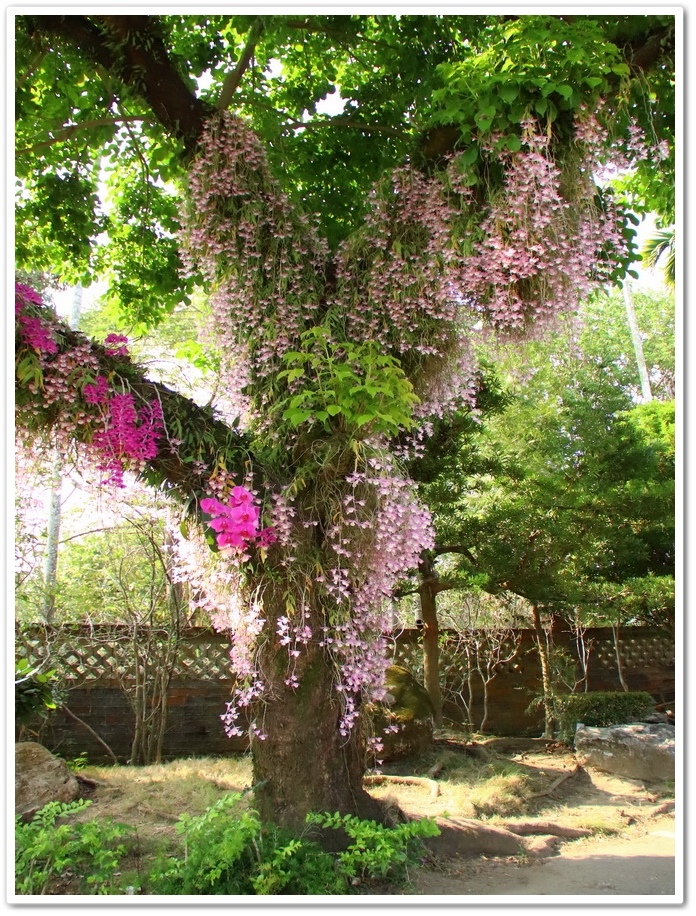 餐廳園區種植了數棵茄冬樹,樹上掛滿了『天宮石斛蘭』,鞭狀莖粉紅花瓣垂落,盛開後宛如粉紅色瀑布,因此也被稱為『瀑布蘭』,花期可持續20至30天