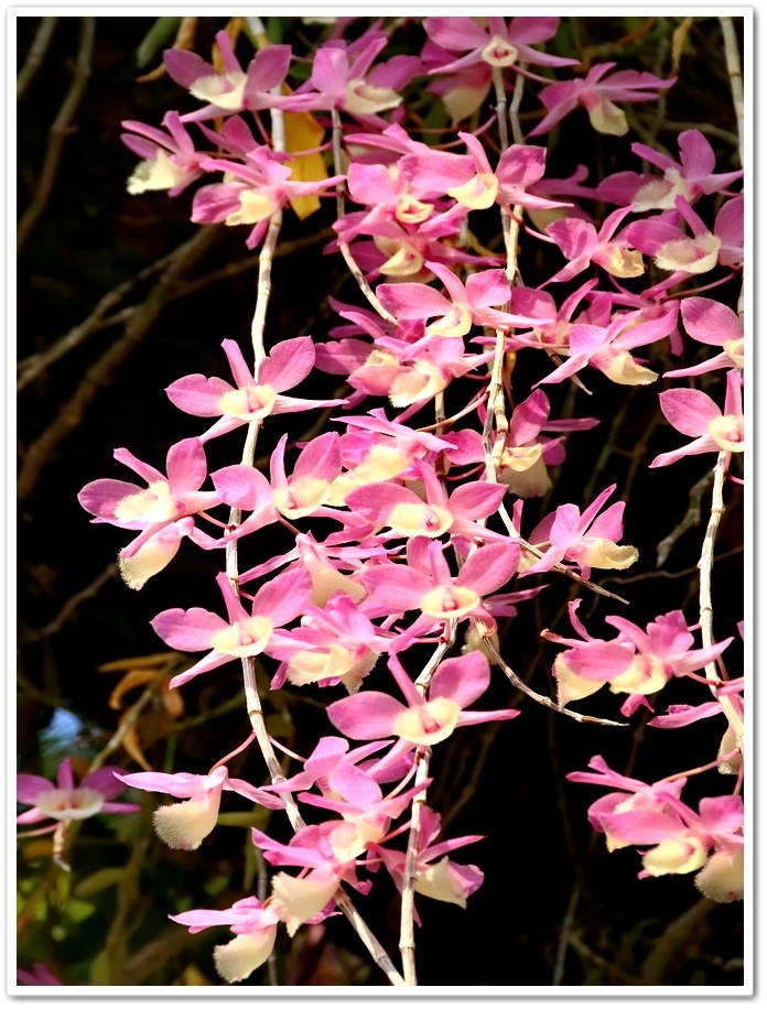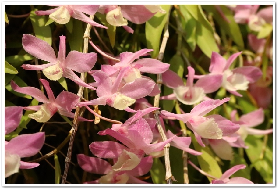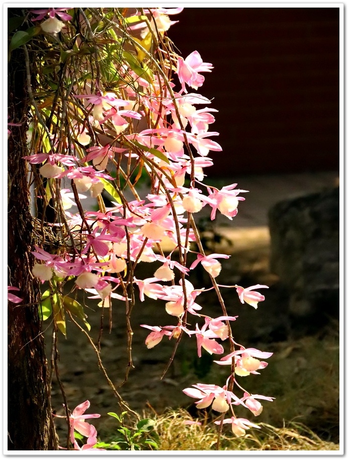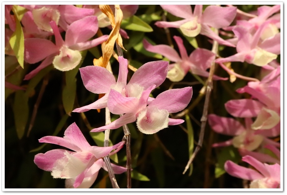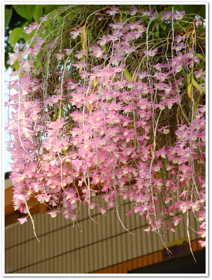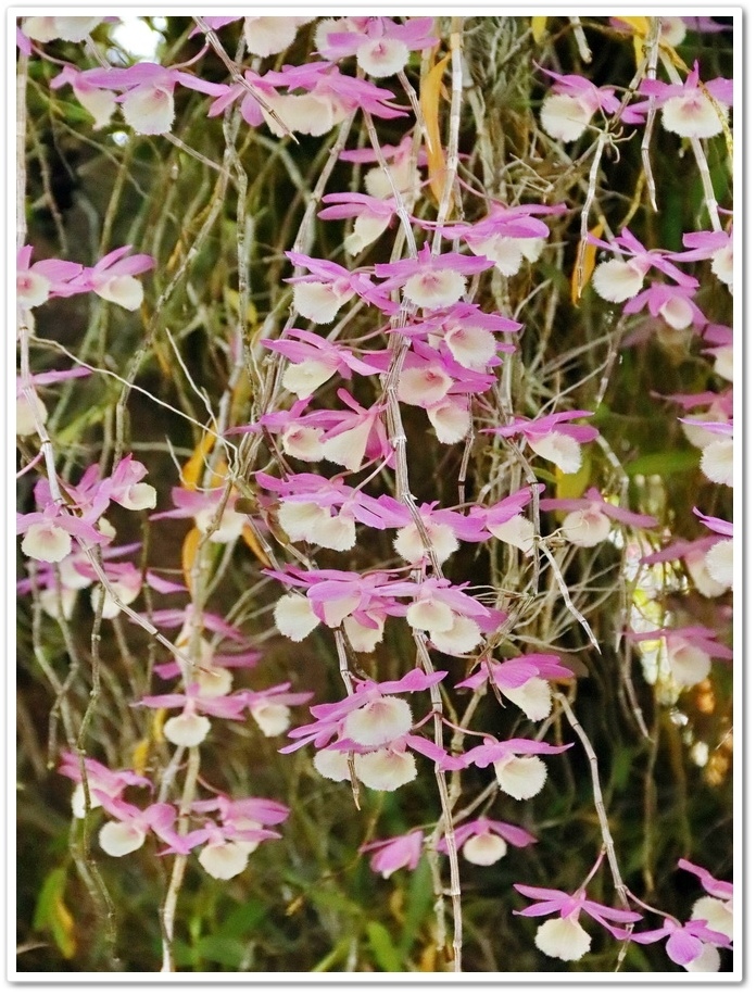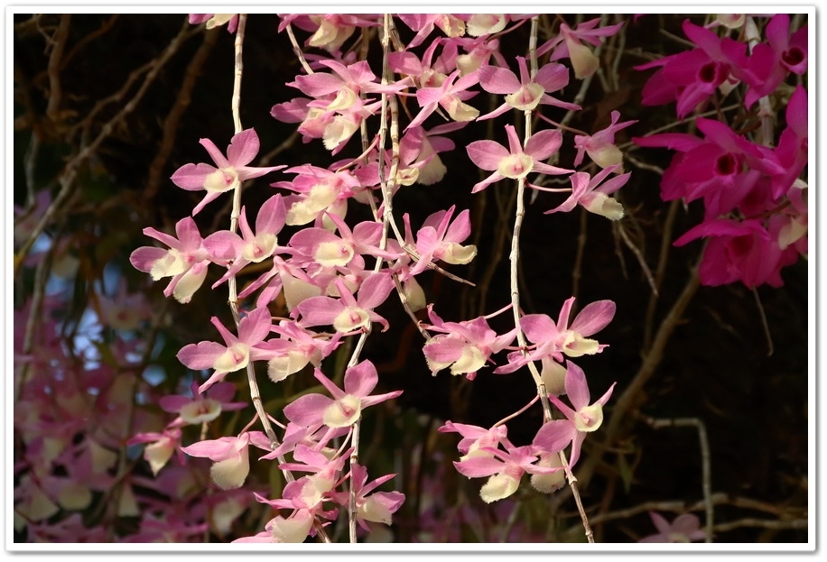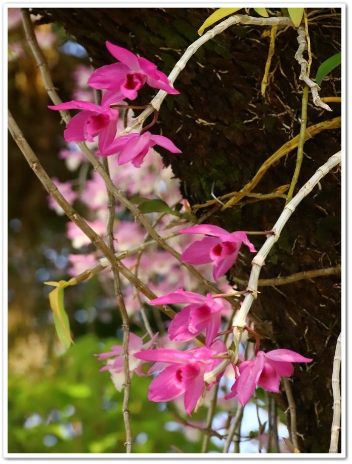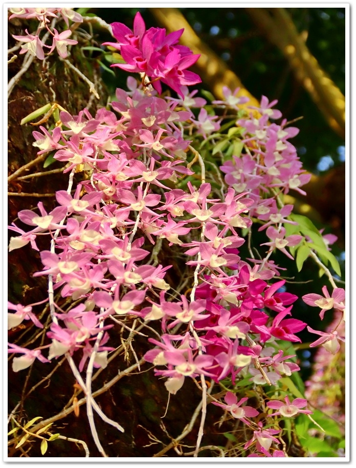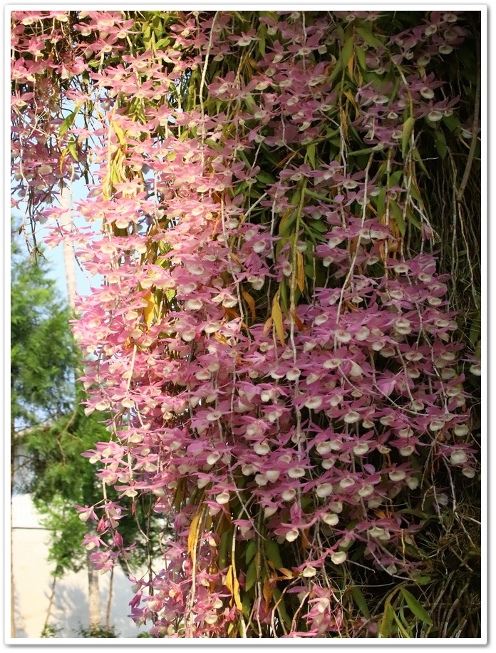 石斛蘭蔓生在樹幹上相當壯觀,千條石斛蘭垂下的美麗畫面令人目不暇給,而粉紅花朵有綠葉搭配,更是賞心悅目