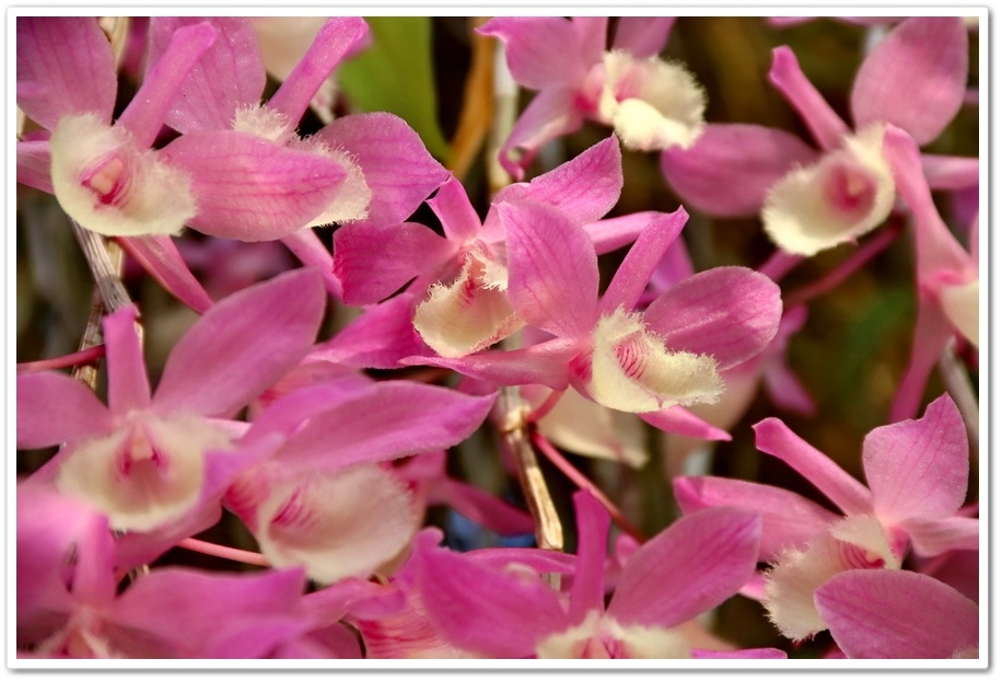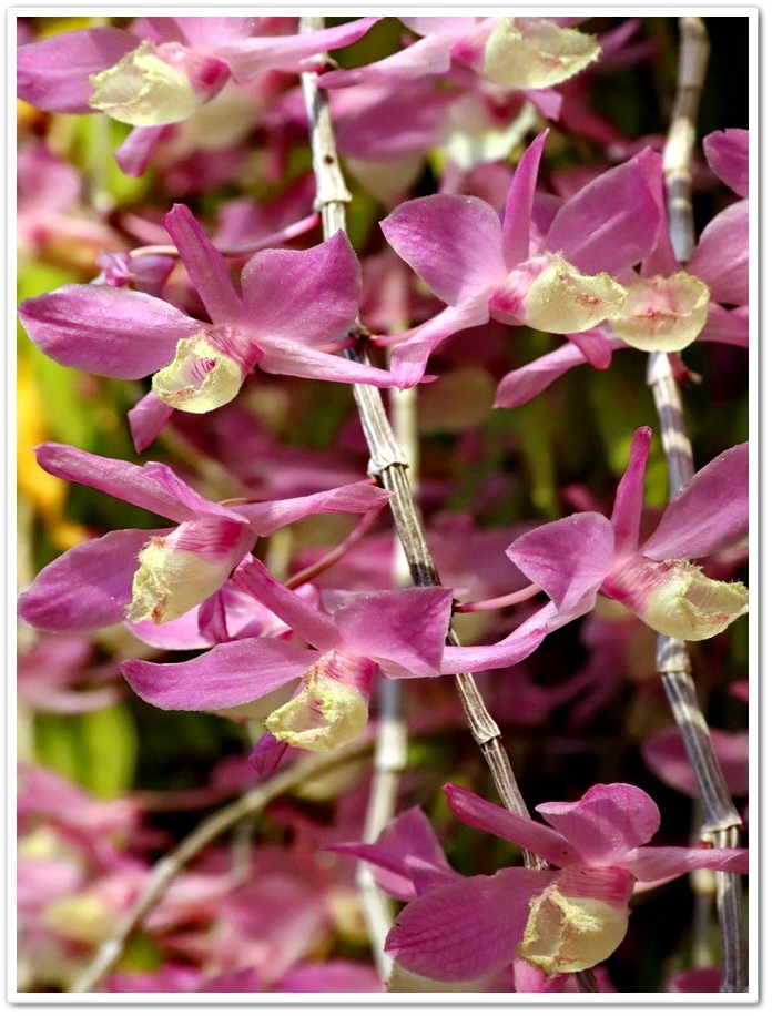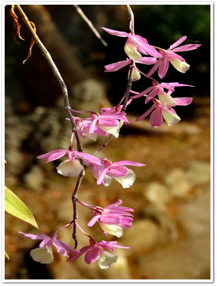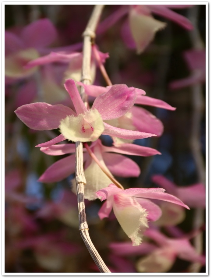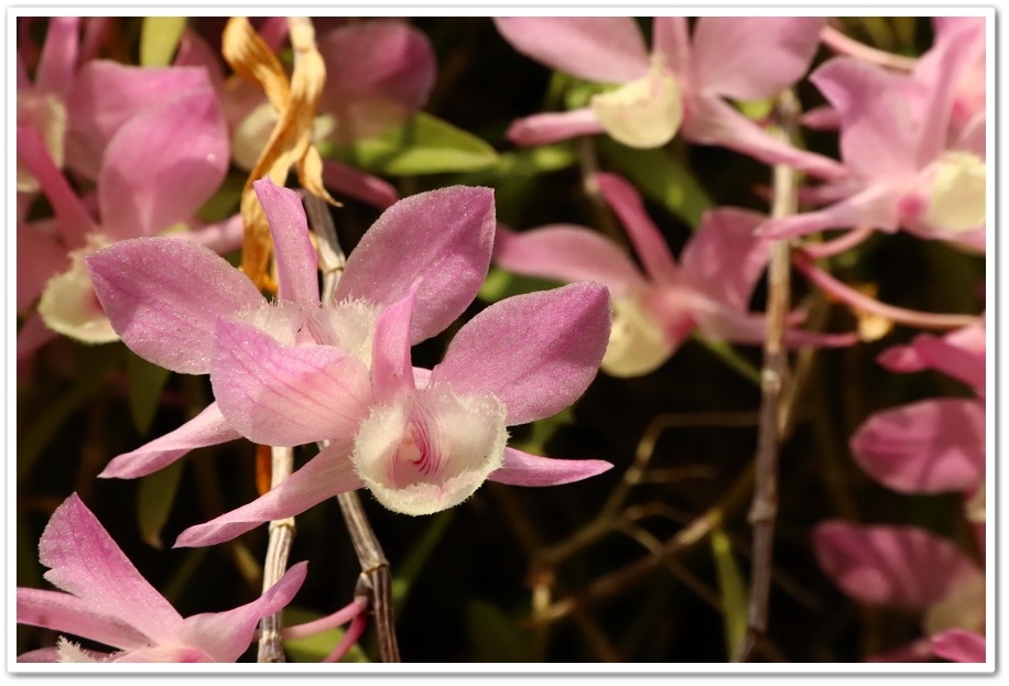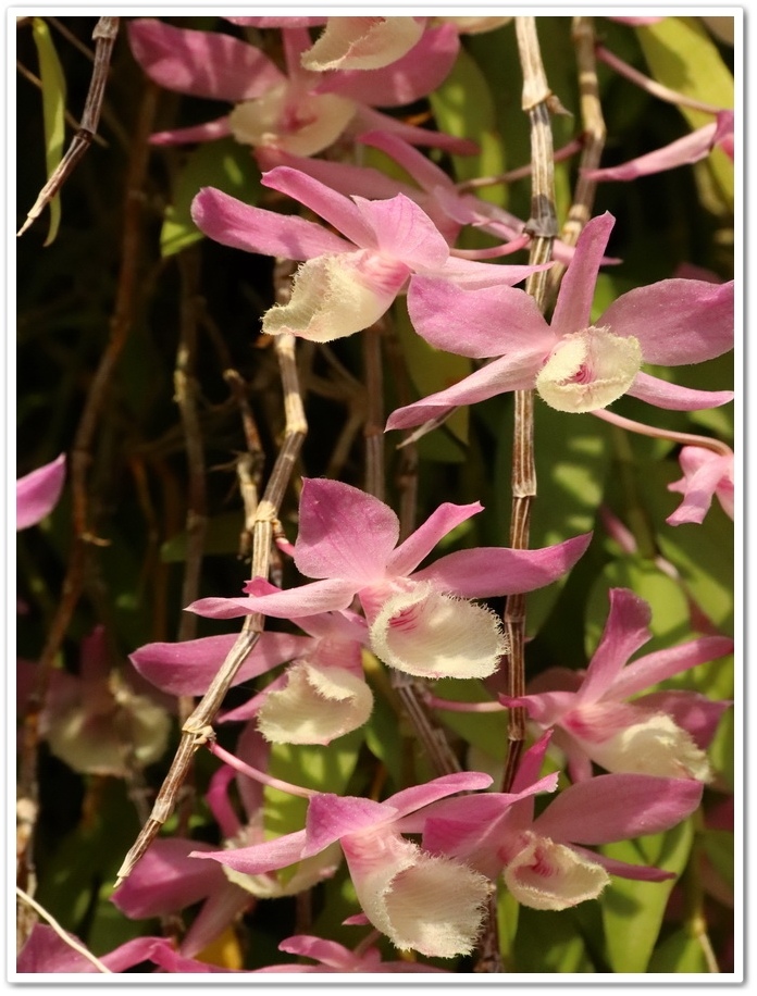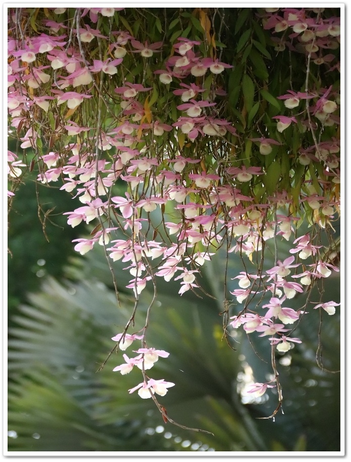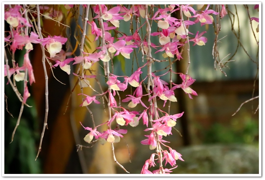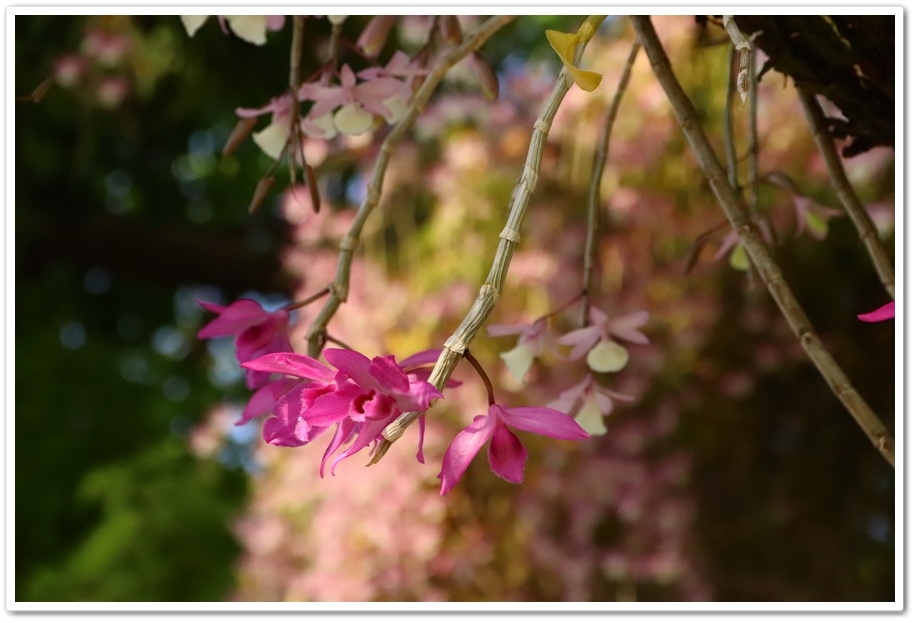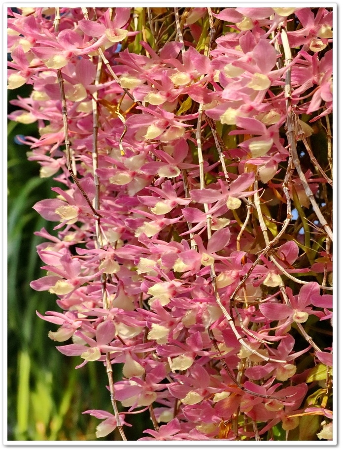 石斛蘭蔓生在樹幹上相當壯觀,千條石斛蘭垂下的美麗畫面令人目不暇給,而粉紅花朵有綠葉搭配,更是賞心悅目