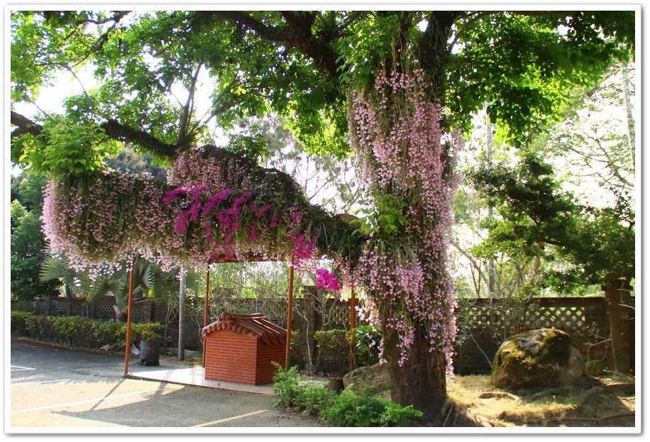 一進入『佳鄉庭園餐廳』,幾千朵盛開的石斛蘭像粉紅瀑布般傾洩垂掛而下,這樣的花色美不勝收,絕對讓人駐足或流連忘返。尤其餐廳供奉『地基主』小廟旁的石斛蘭迎賓盛開,怎樣拍的角度都很美