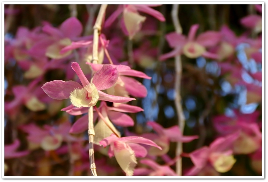 『佳鄉庭園餐廳』的石斛蘭以『天宮石斛蘭』為主,數量多達千株。寄生於樹幹上粉色花朵一串串垂墜下來,宛若粉紅瀑布般傾瀉而下,如夢似幻超級浪漫的,讓我按快門的手真的捨不得停下來