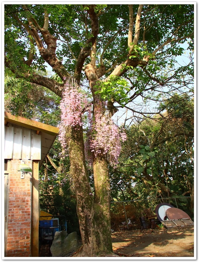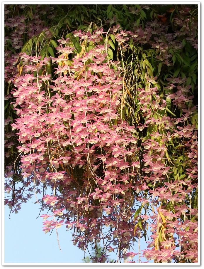 超壯觀的石斛蘭像瀑布般傾瀉而下,數以千計的粉色石斛蘭大爆開,掛滿在茄苳樹上,粉色花朵一串串垂墜而下,密集花序相當壯觀