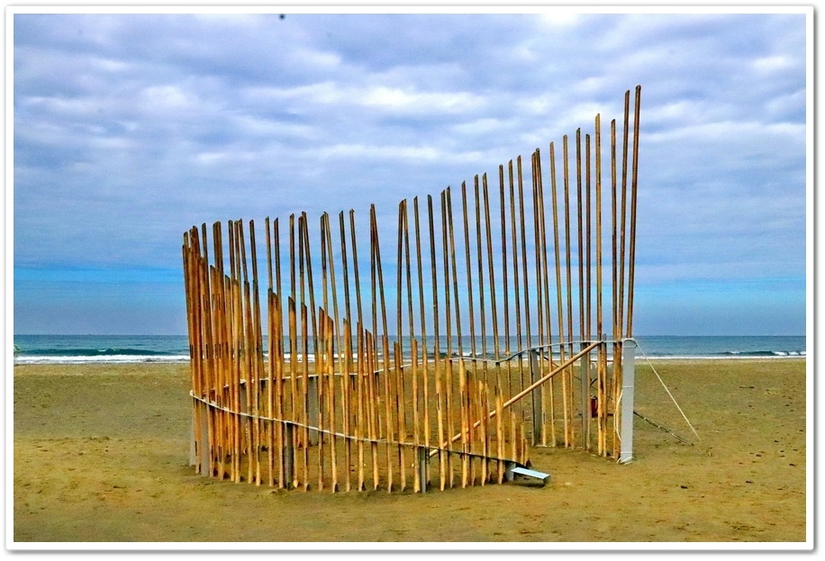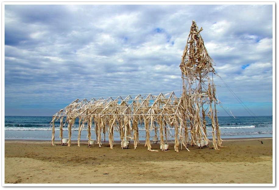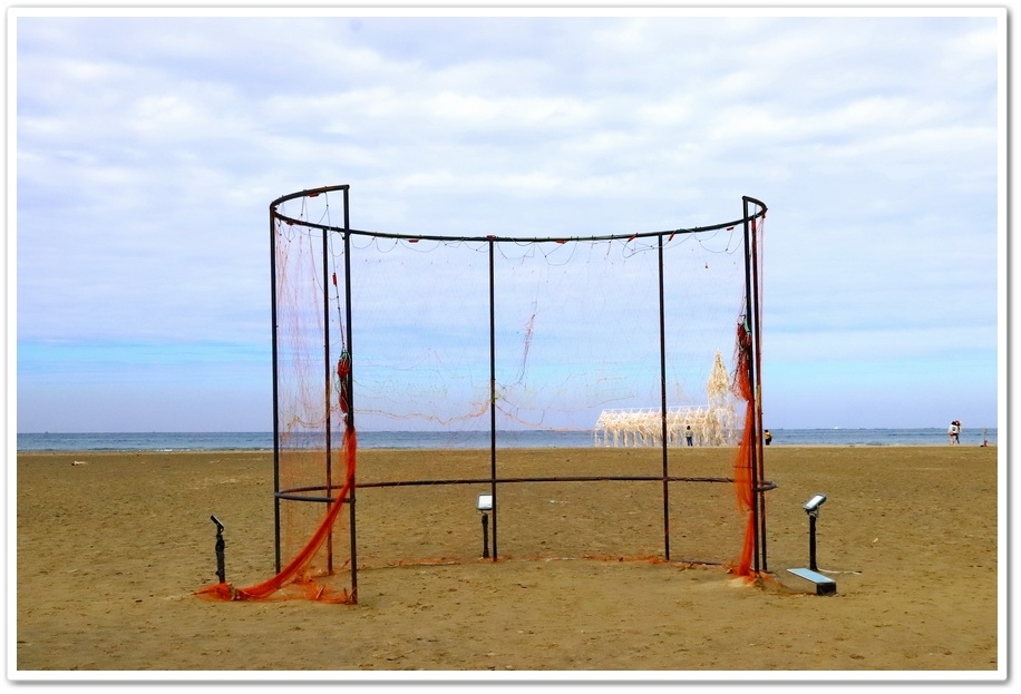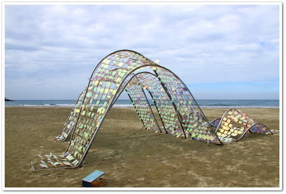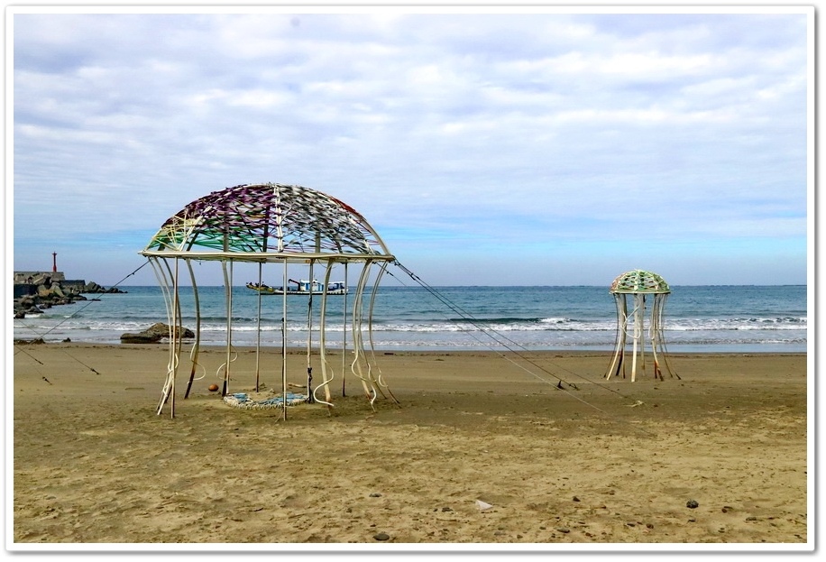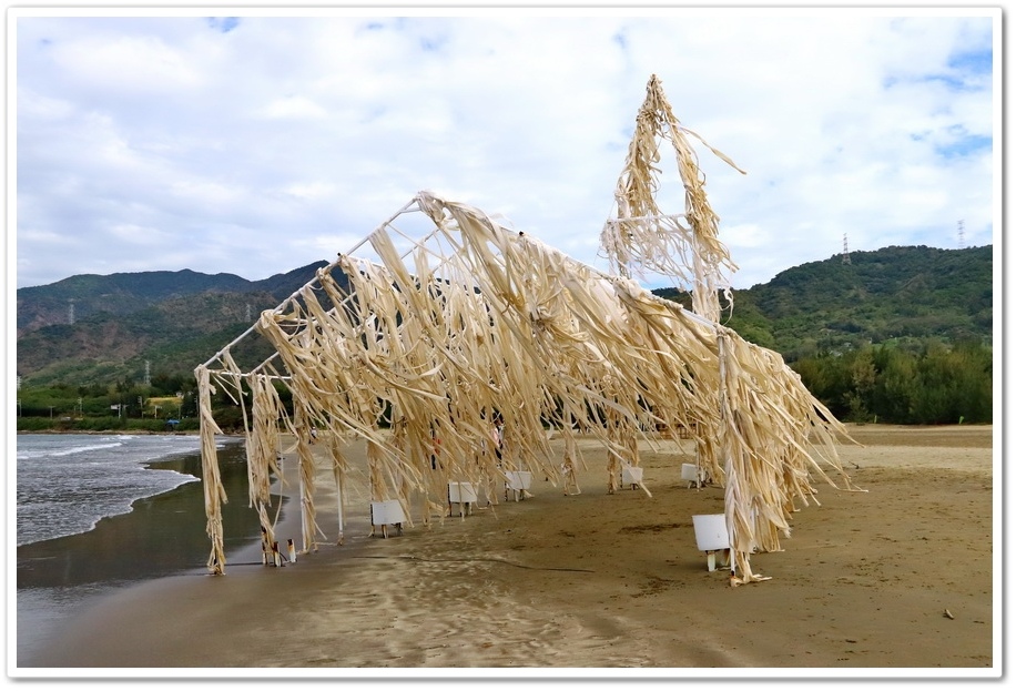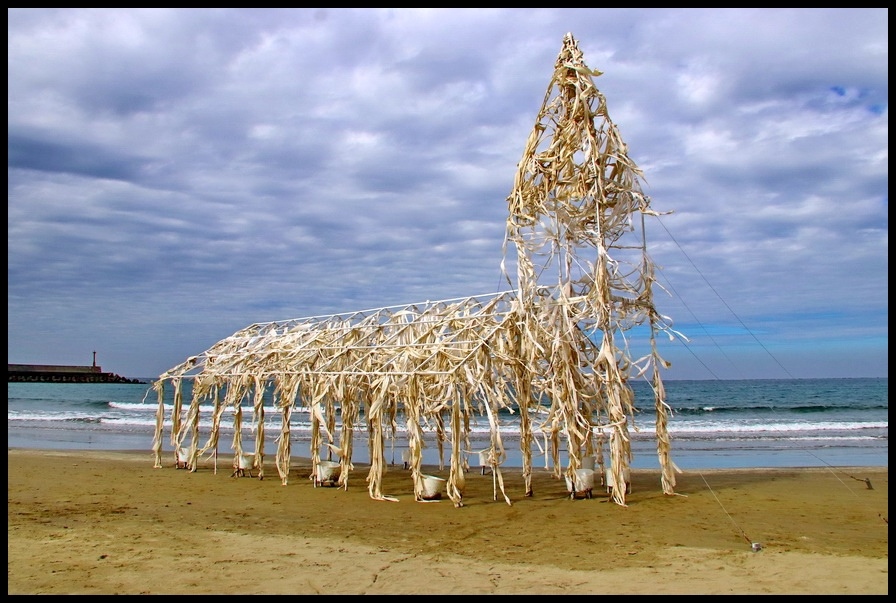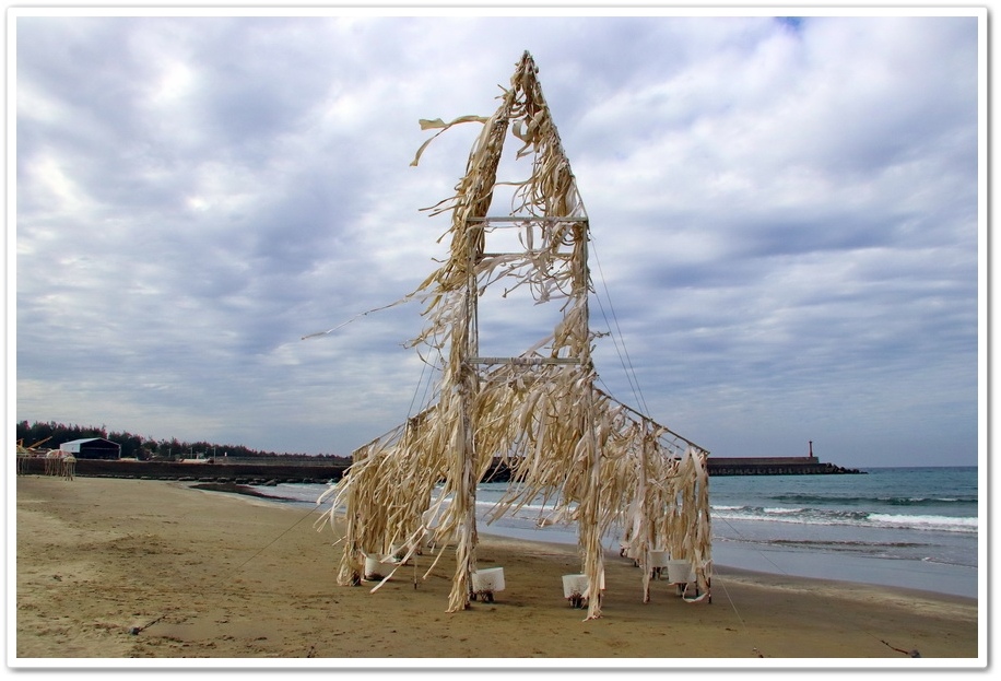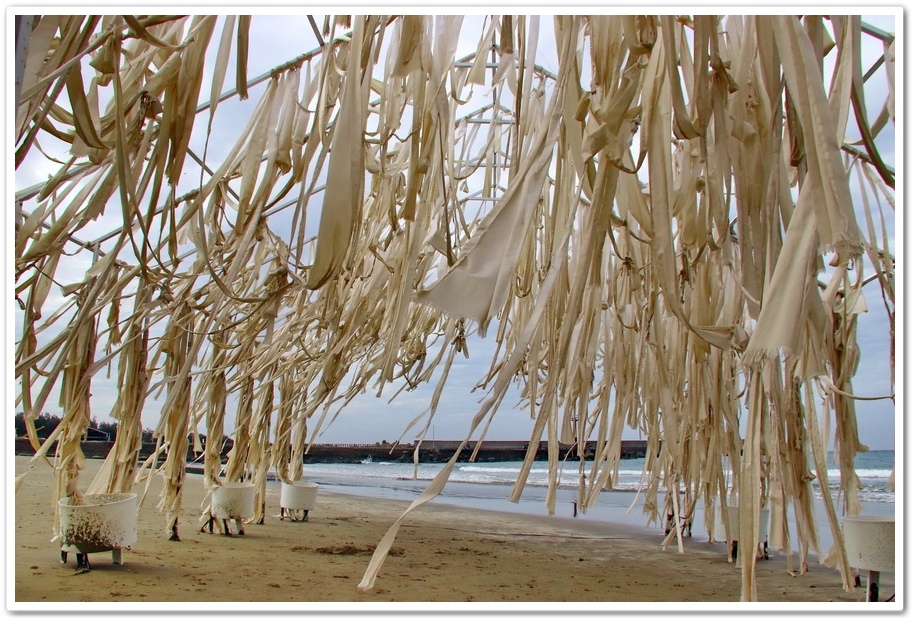 由設計師『朱志康』以鐵件、木材與布料打造而成的『來自海上的祝福』,猶如一座海灘上的白色教堂,而當其與海風產生互動時,隨風飄逸的白布條,也讓人看見來自風的祝福