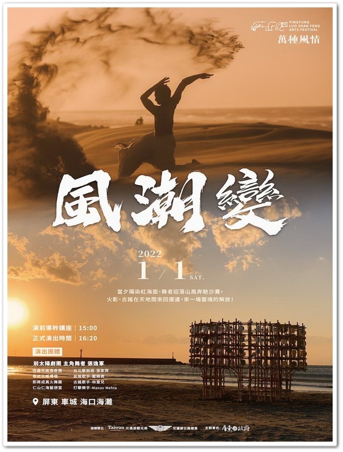 並於2022年1月1日限時推出原創沈浸式舞劇『風潮變』,透過表演,帶領大家從不同角度,欣賞18件藝術創作,同時帶來精彩的在地樂手表演、高空馬戲與火舞表演,當夕陽染紅海面,舞者迎落山風奔馳沙灘,火影、古謠在天地間來回擺盪,來一場靈魂的解放!