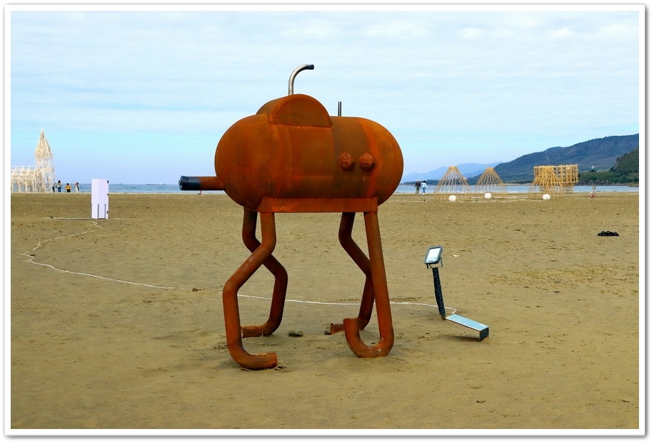 ▲編號6號作品:望風潛水艇。藝術家:瑞士 A-space network。藝術家將潛水艇想像成從海上爬上來的可愛動物,因此外觀呈現童趣的意象,而以金屬為材的作品,也呼應當地『逆風前行,與之共存』之意涵