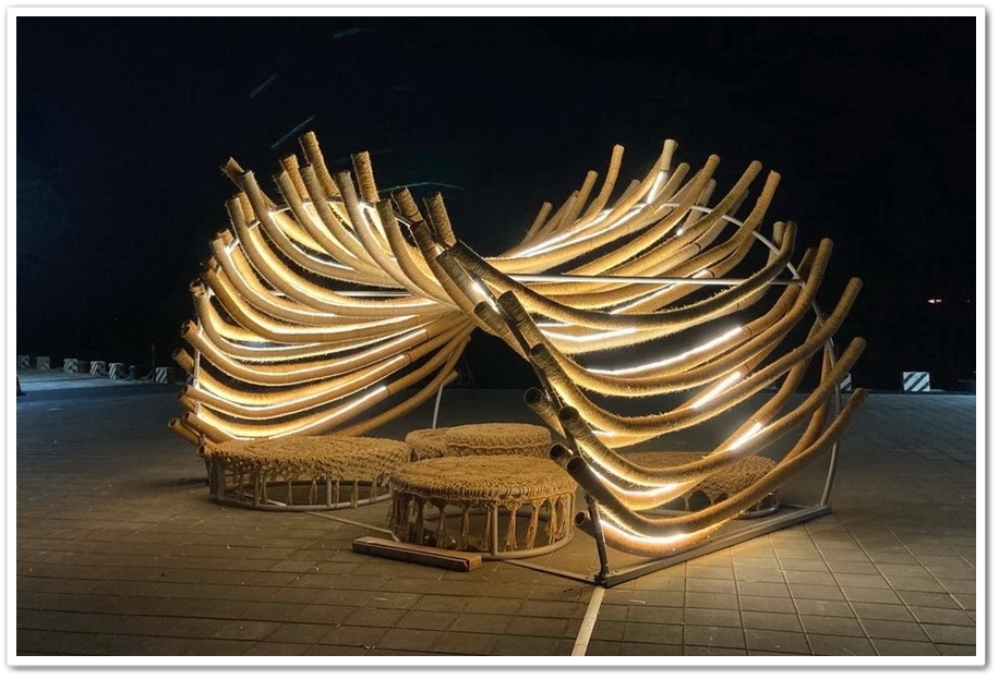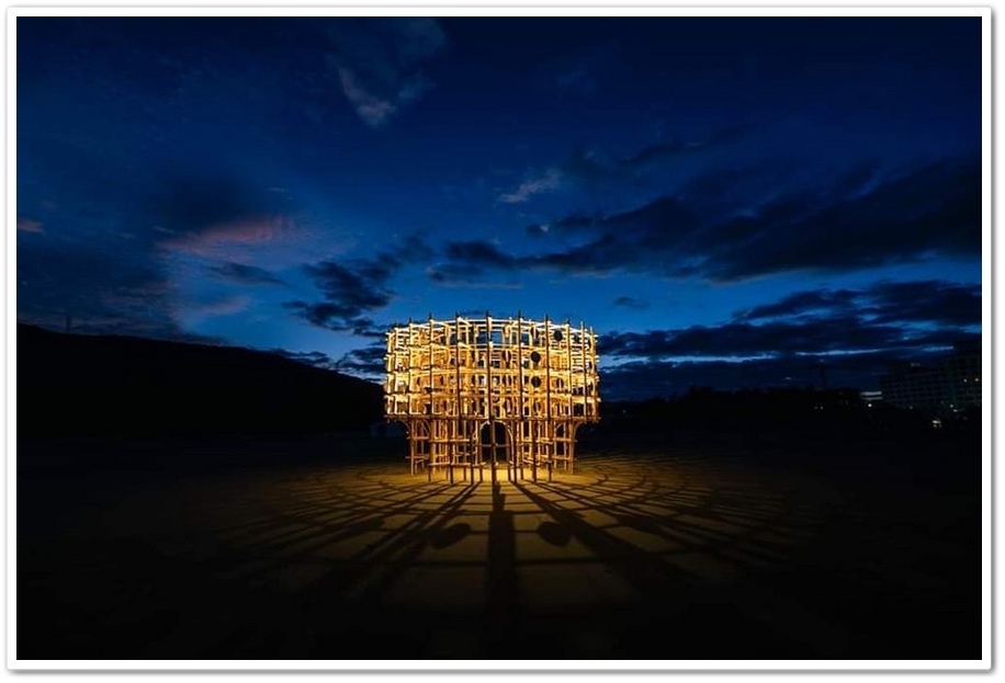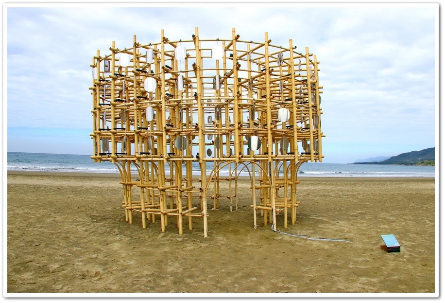 『跟風‧起舞』外觀猶如沙灘上的三顆洋蔥,其以竹子與金屬為材,塑造出一個個空間,人們可以坐進裡頭,感受作品細緻的結構,以及隨著落山風微微晃動的節奏感;晚上時,周圍放置的LED燈條亮起,也呈現出一種魔幻之美