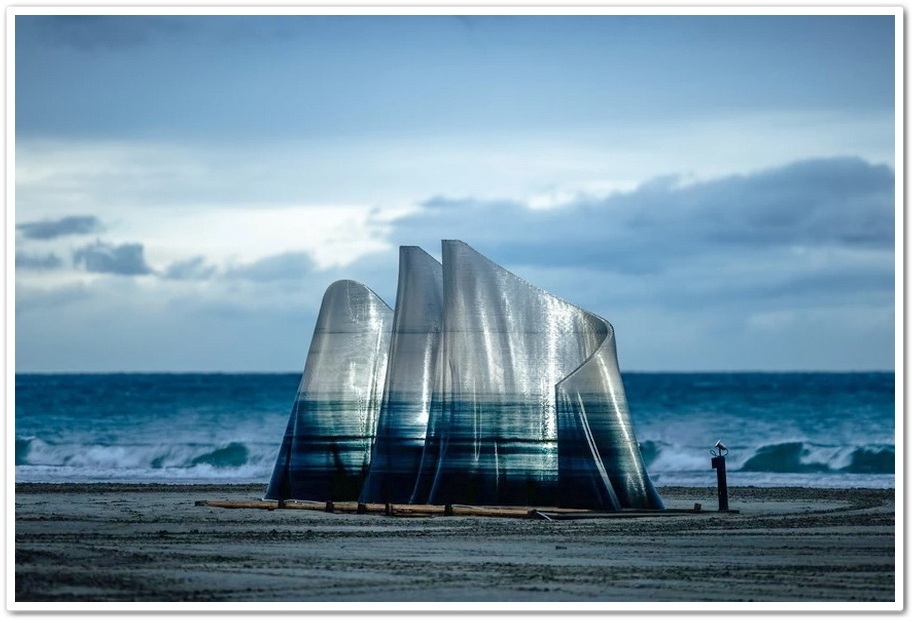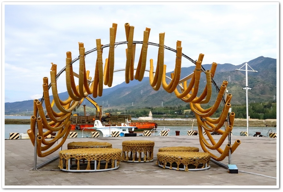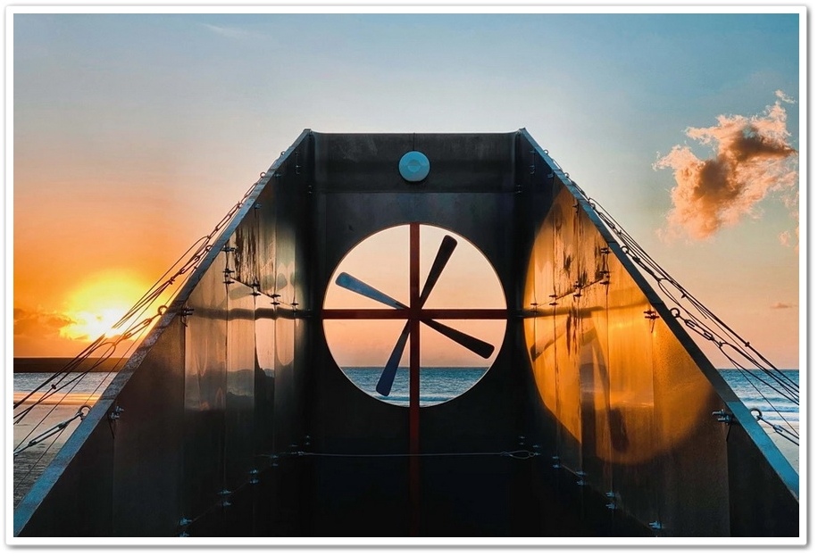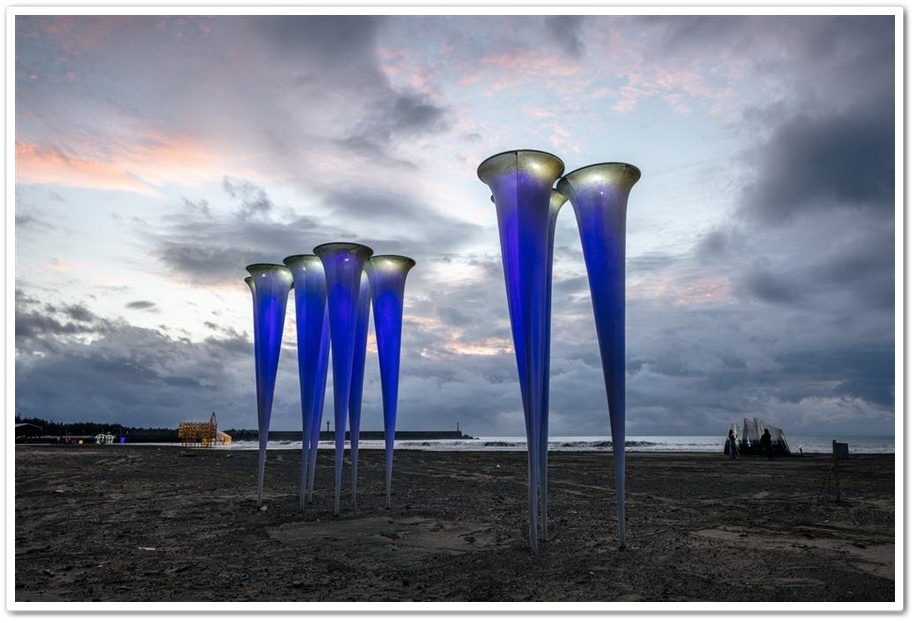由群眾自行打造的『風濤』,外觀形狀猶如海浪一般,而上頭的虹膜片在陽光的照射下,映照出七彩斑斕的光波,也像是海面上的波光粼粼,與一旁的大海相呼應,傍晚後,在燈光的照射下,也別有一番韻味