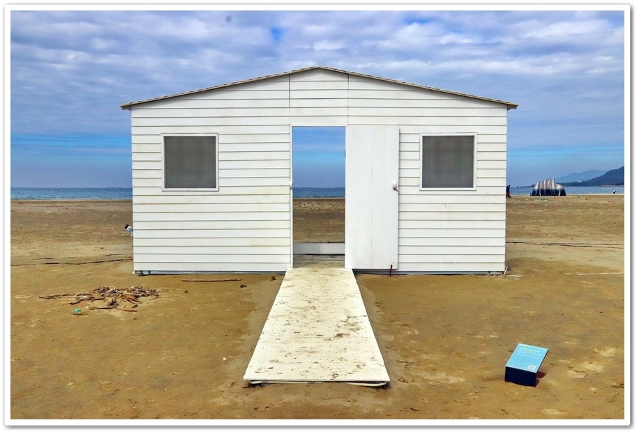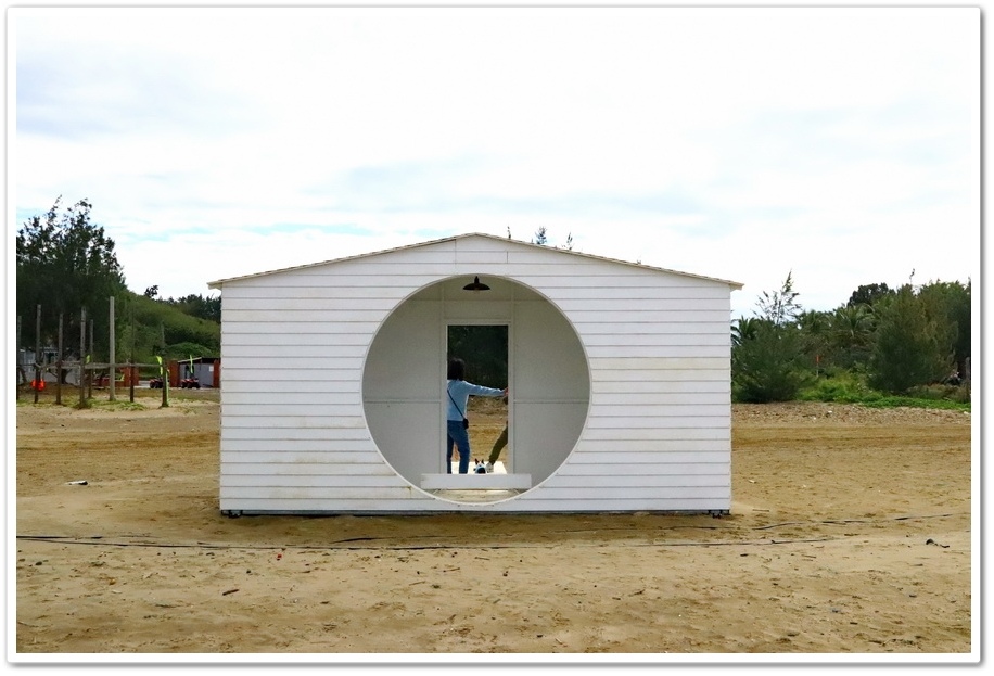 以木材及鐵件打造而成的作品,猶如佇立在沙灘上的小白屋;觀者可以沿著作品中間的走道、走進裡頭,坐在白椅上,好好感受圓窗外的藍天大海與沙灘景色,或者慢下來等待自己心目中的一處理想風景