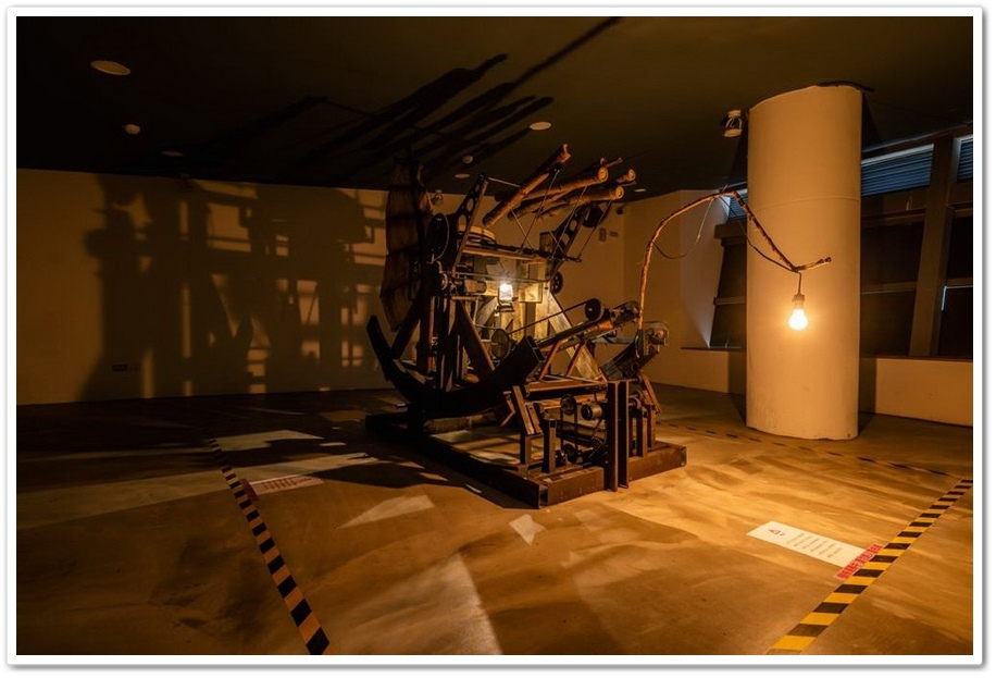 ▲編號1號作品:海口潮聲(官網)。藝術家:王誌成 X 耳邊風工作站(看海美術館內展出)。由曾擔任《天橋上的魔術師》美術指導的『王誌成』所打造的『海口潮聲』,藉由電影的『擬音』手法,探索『潮聲』的存在。以單純機械結構組成的作品,外觀帶有復古懷舊感,而耳邊傳來一陣一陣的海浪聲,則是沙盤中隨著裝置擺動的豆子所發出,讓人猶如置身於海港旁,享受陣陣的療癒聲響