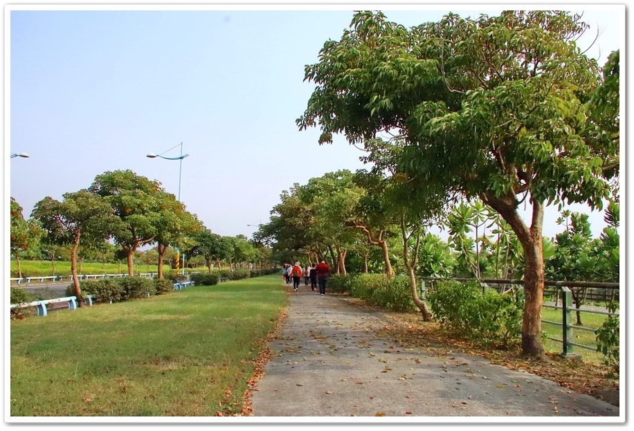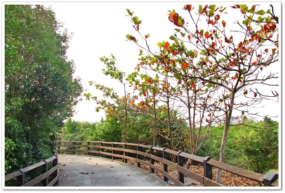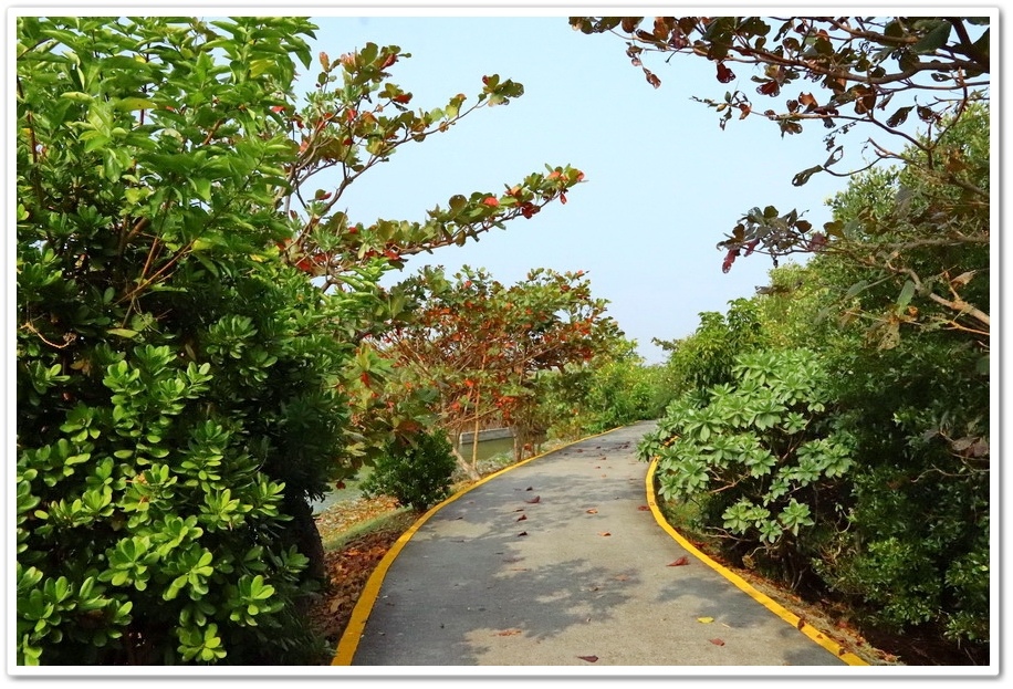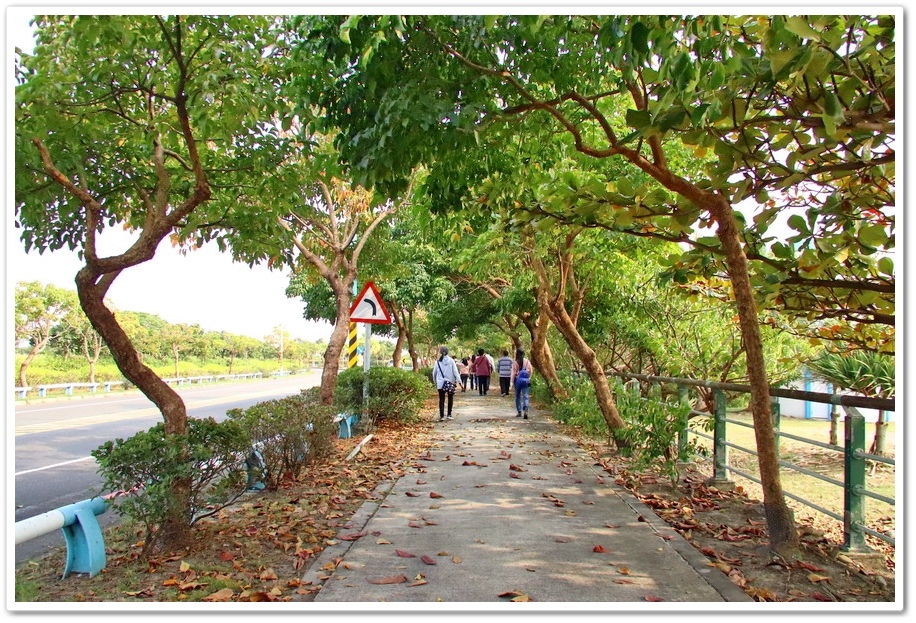 然後經過藍白色的風車後,就是接到『大鵬灣環灣道路』,環灣道路內側因種有一整排矮灌叢樹,所以當時我們並不知道已走回『大鵬灣國家風景區』的灣域,而這條環灣道路則會連結到『大鵬灣管理處』停車場,整條路的風景也是很美