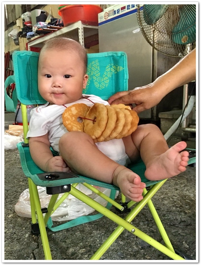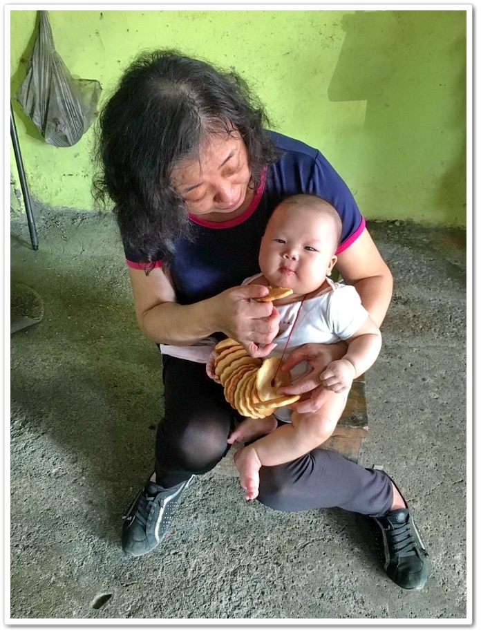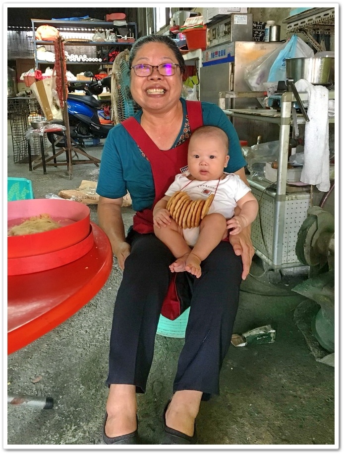 (下圖)是次孫與其外婆,而這酥餅可是外婆準備的呦!『收涎』這天外婆會『送頭尾』給次孫,裡面有一樣『涎垂』俗稱『頷垂』,是給嬰兒掛在胸前作為承涎之用,尤其是嬰兒到長牙時期最容易流口水,往往會流的胸前一片濕糊糊,因此就掛上涎垂,以維護胸前衣襟的乾爽