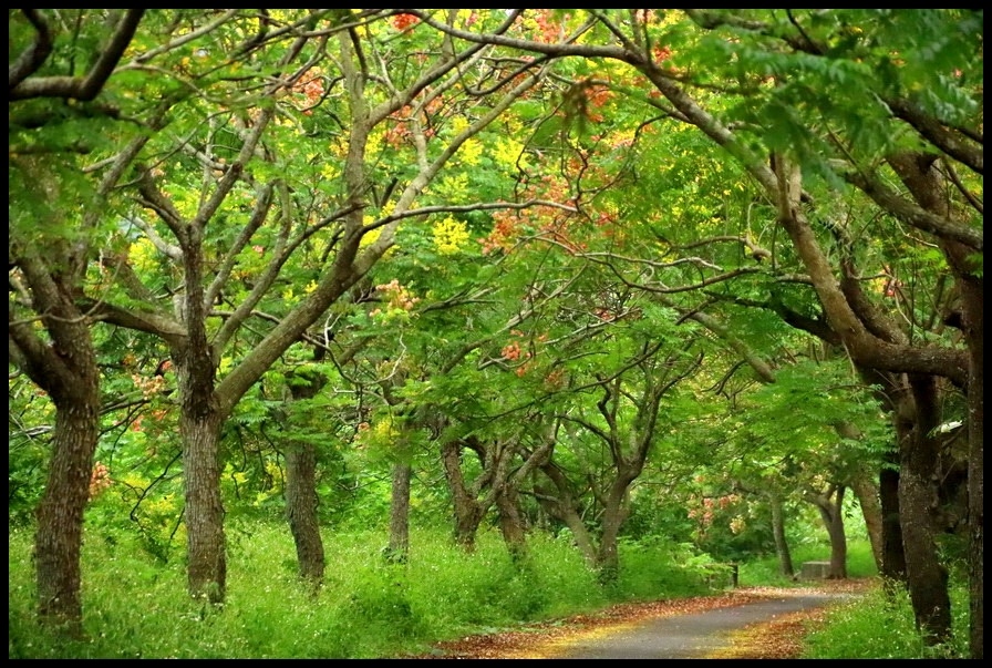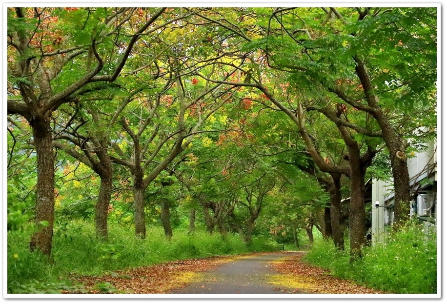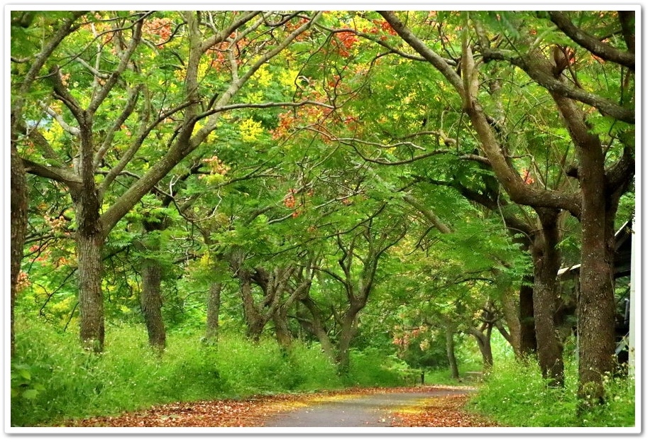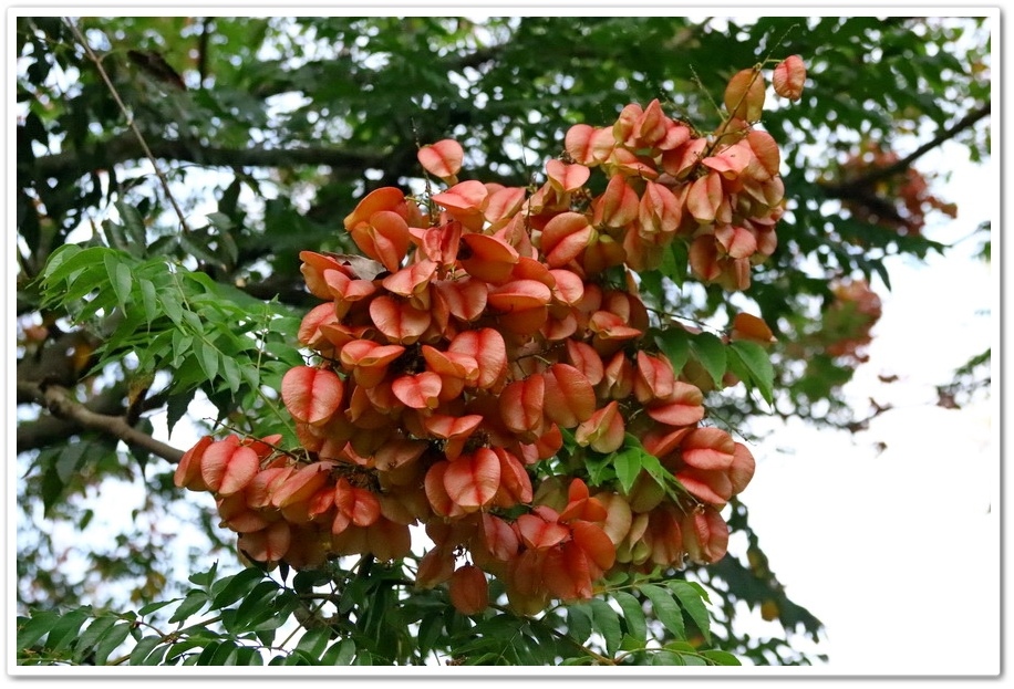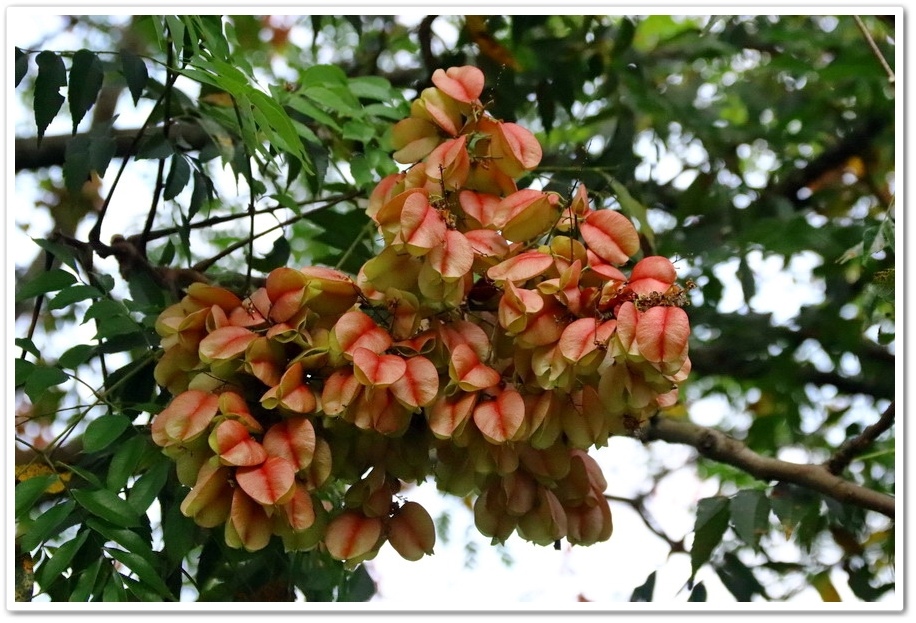 樹梢多紅色蒴果,帶著膨脹氣囊狀可愛極了!一串串的似小燈籠高掛樹梢上,紅、黃、綠交錯更是醒目,為綠色隧道增添了一點秋色,秋天即景好迷人,或許這就是台灣欒樹特有魅力吧!