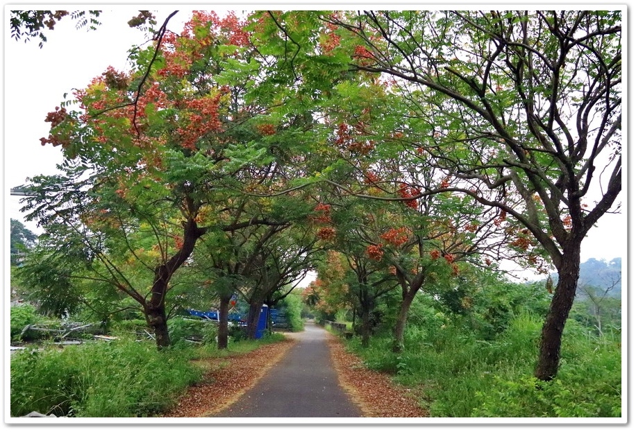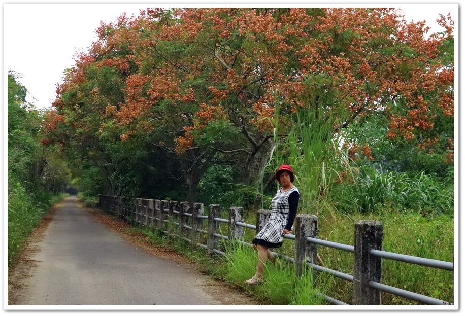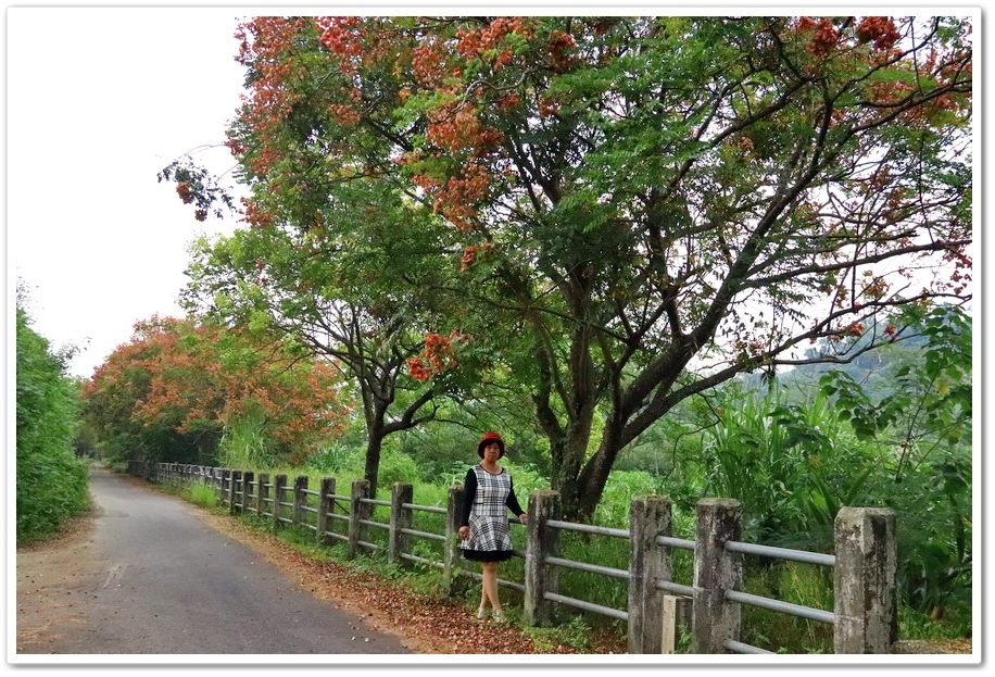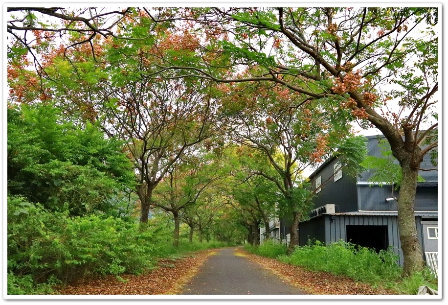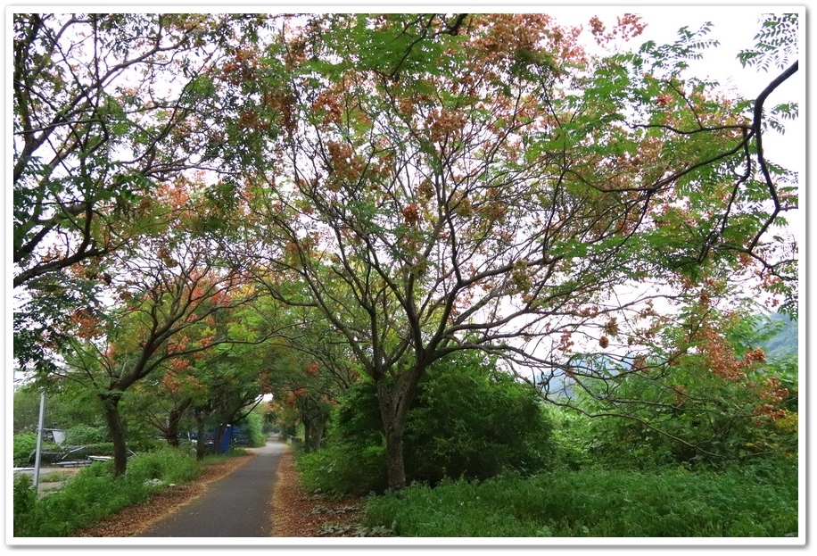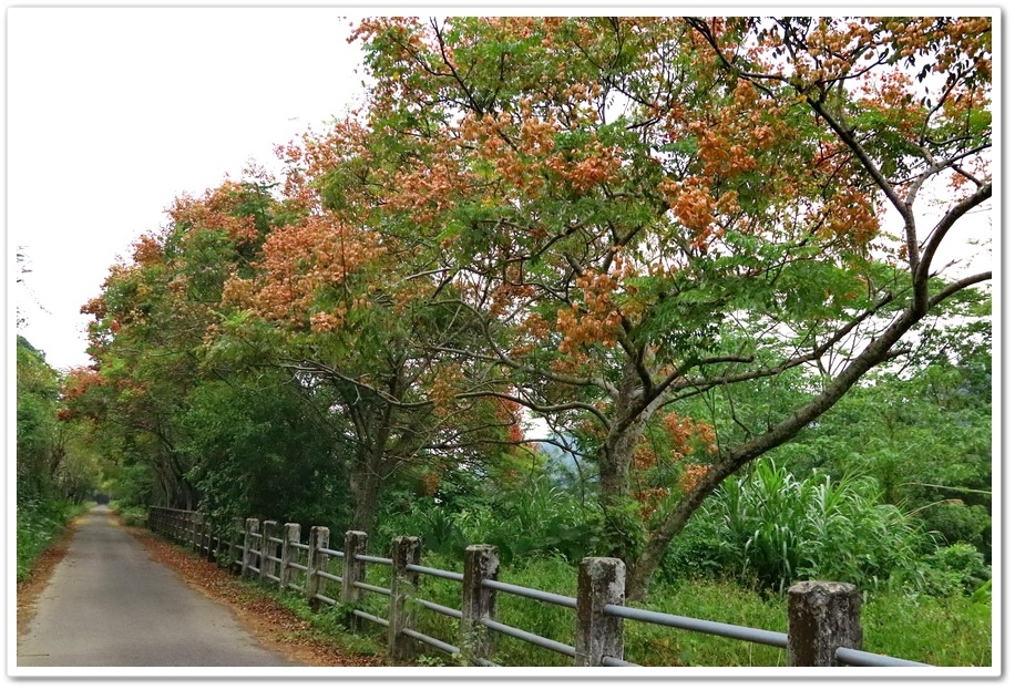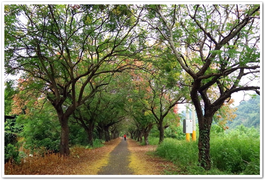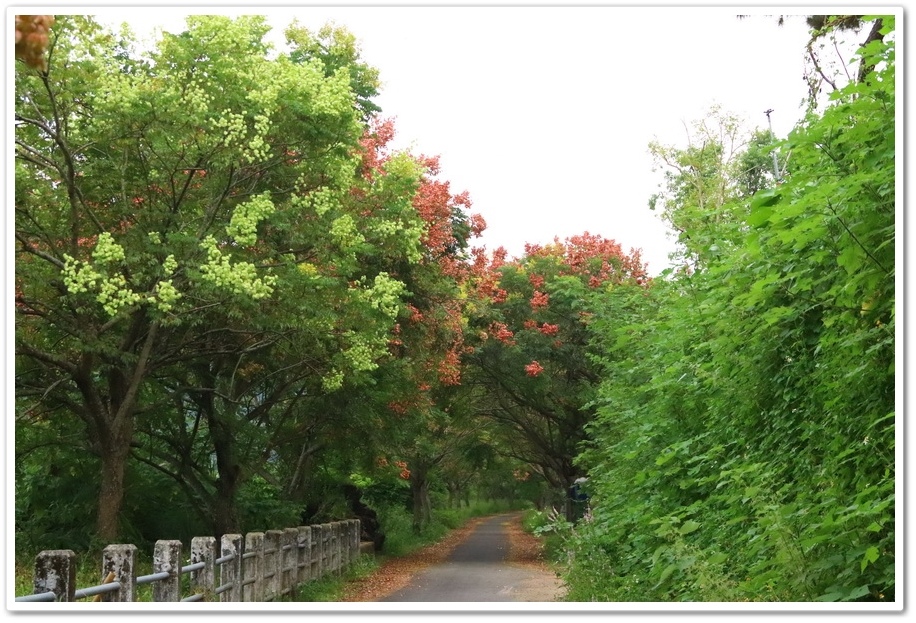 在『初鄉橋台灣欒樹自行車道』中,我們只走到這裡為止,然後就再往回走拍攝,因為再過去的台灣欒樹只剩單邊而已,而且欒樹看起來也稀稀落落,美感不再!往回走時!不同角度也拍出不同的意境!
