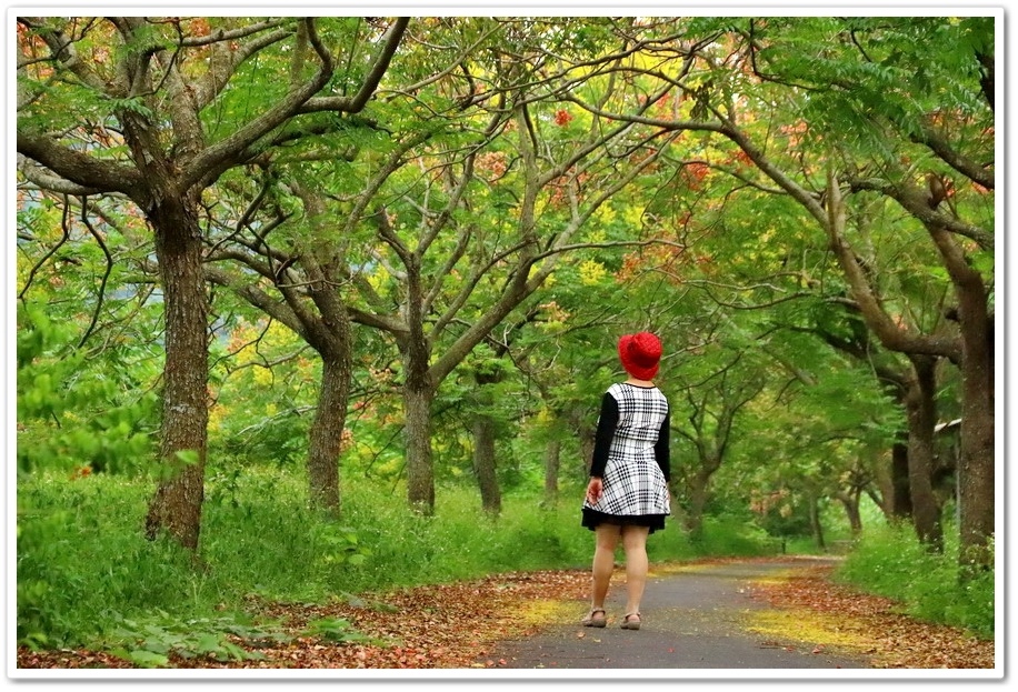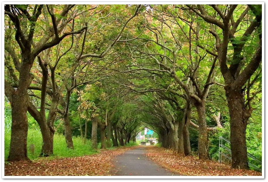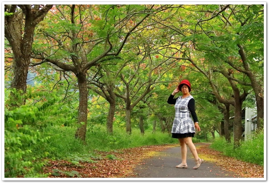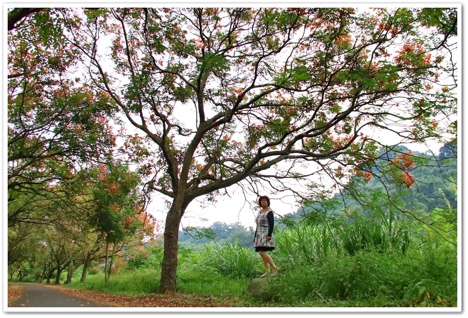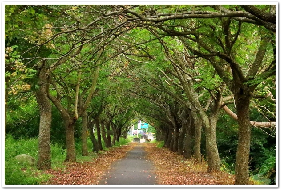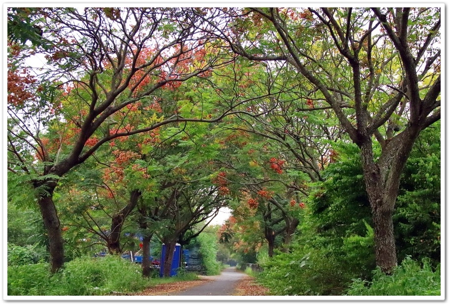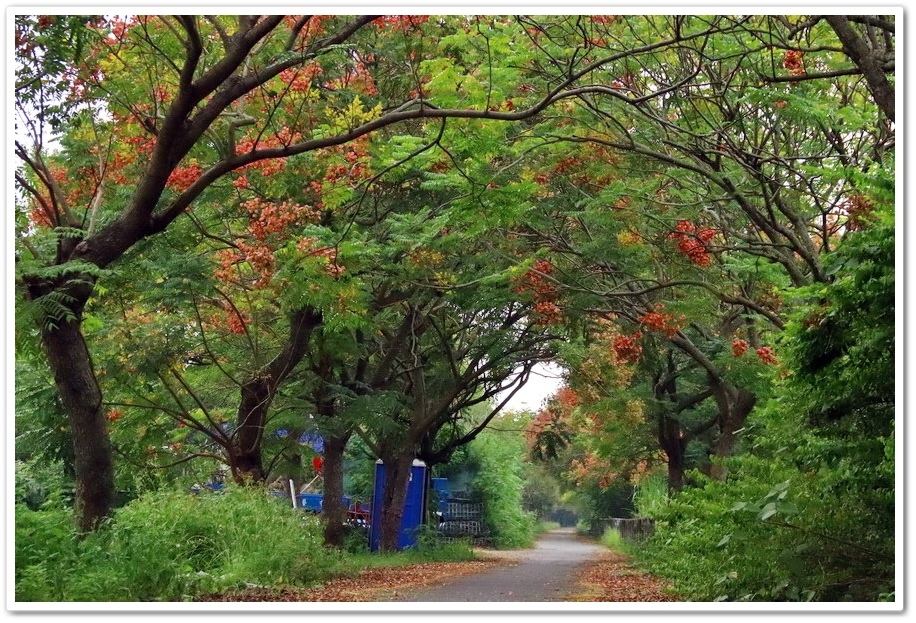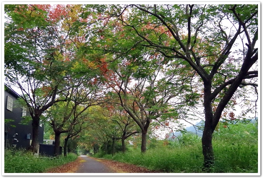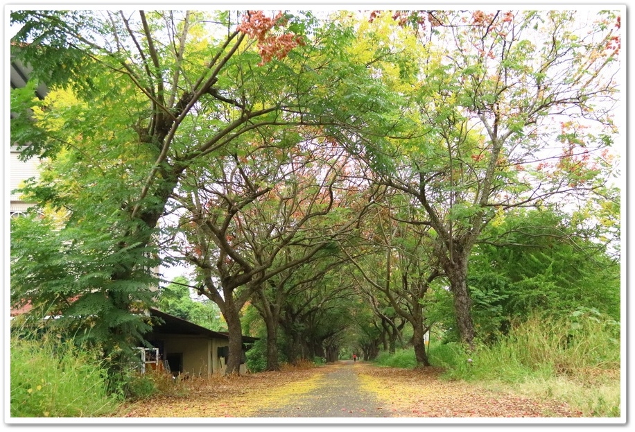 在『初鄉橋台灣欒樹自行車道』中,我們只走到這裡為止,然後就再往回走拍攝,因為再過去的台灣欒樹只剩單邊而已,而且欒樹看起來也稀稀落落,美感不再!往回走時!不同角度也拍出不同的意境!