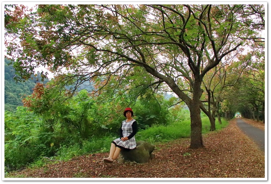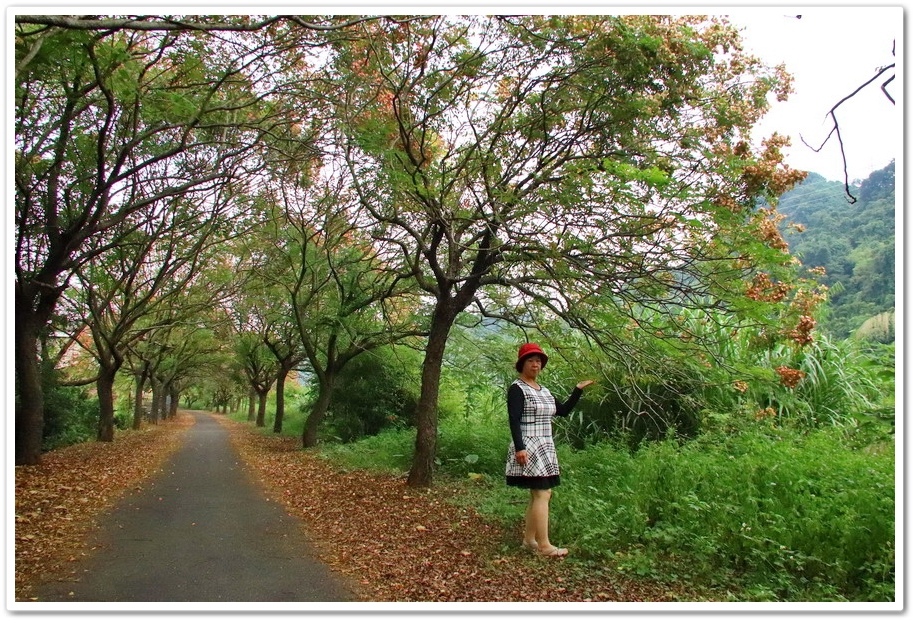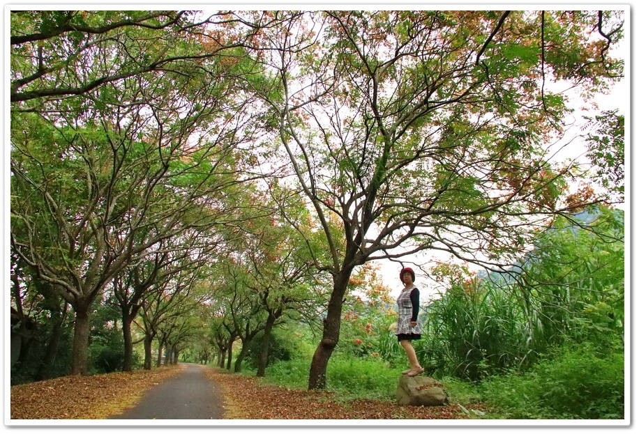 在這2公里長的『台灣欒樹自行車道』,兩端都有設置水泥障礙物,只允許自行車及人行,所以在這裡拍照非常安全,不用顧忌車輛,可以很愜意的走在車道中拍照,且這條『台灣欒樹自行車道』人車稀少,不會有人車干擾