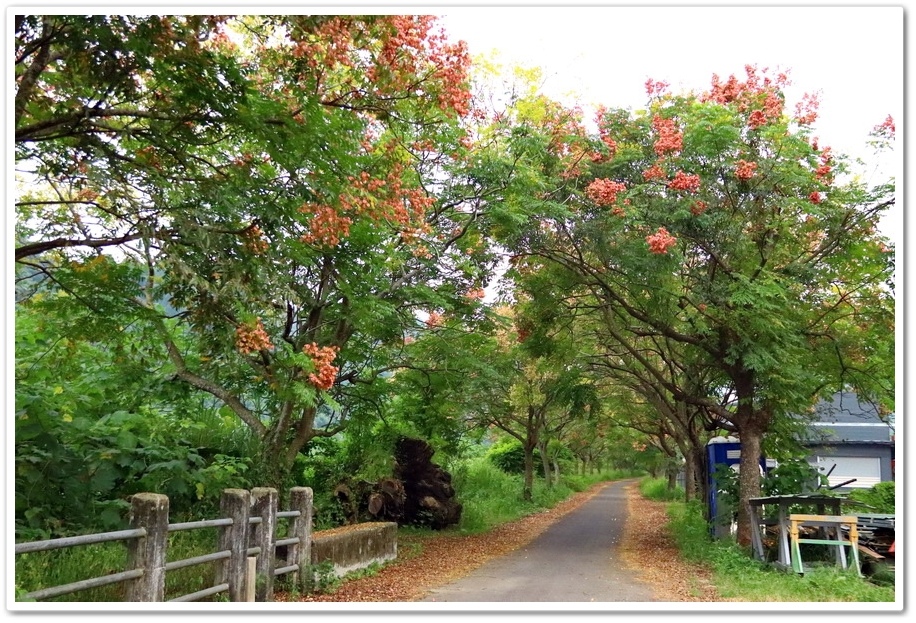 而在『初鄉橋』端入口有一個小小的停車空間,約可停5、6部小型汽車,所以建議把車停在『初鄉橋』端,然後再步行進入拍照!如果不想走那麼遠,那就像我們一樣只拍『初鄉橋』端的台灣欒樹,如果想把它當成運動,走去再走回來要4公里,運動量也足夠了!