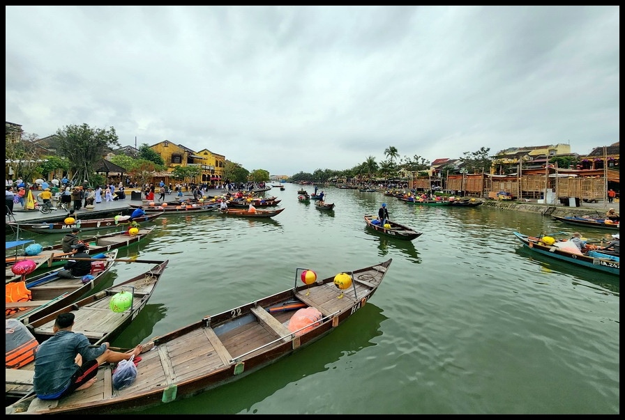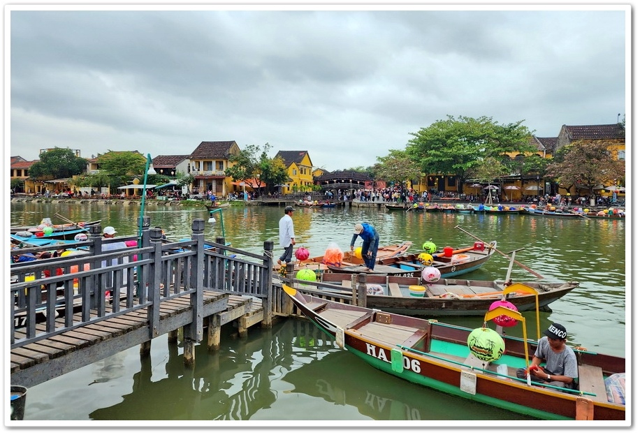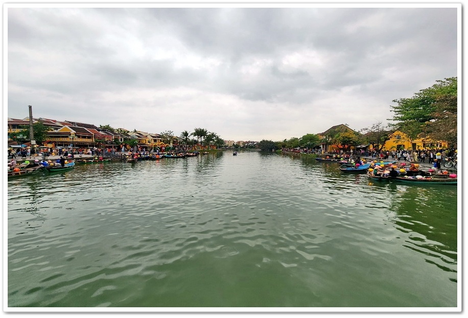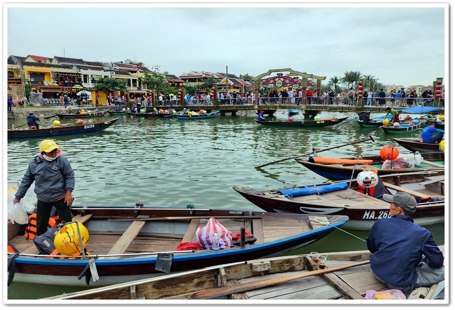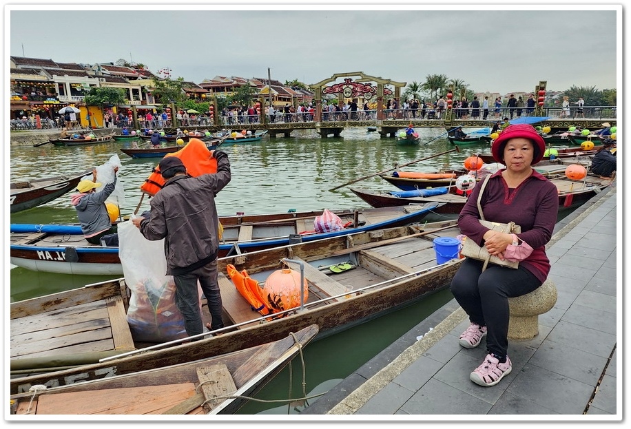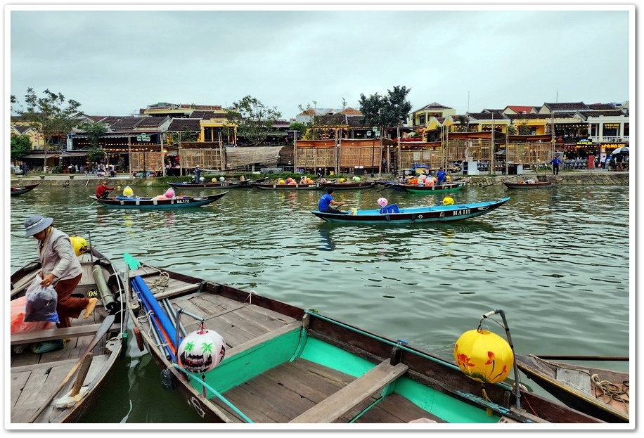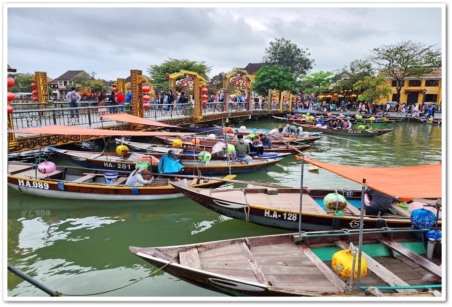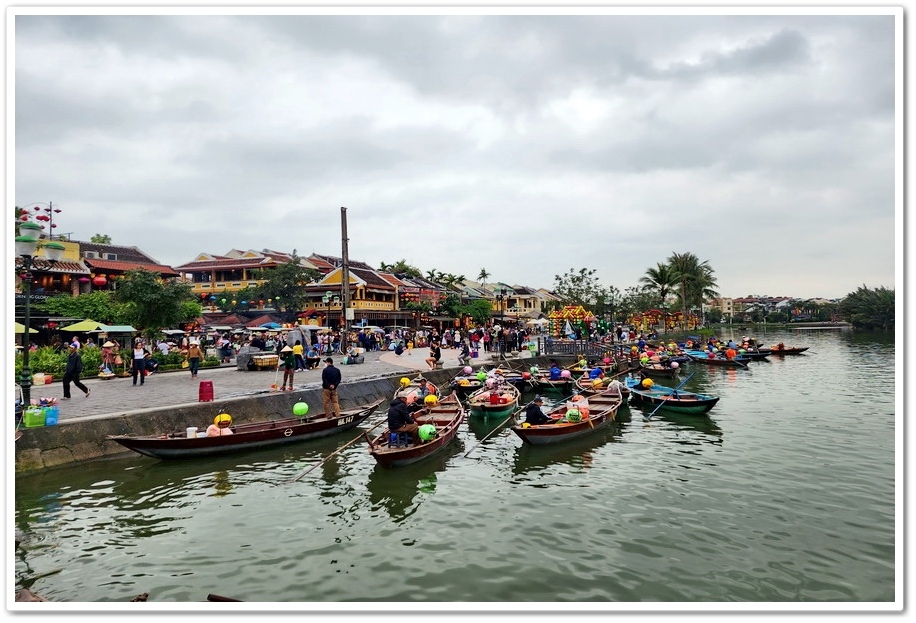傍晚4點半!會安當地的船夫湧現,由於越南白天的氣溫太熱,所以會安最美的時刻就是傍晚,不僅溫度不會那麼熱,還有夕陽等大景出現,所以船上會有帆布給遊客遮陽,但大部份遊客仍以傍晚搭小船遊河為主,船家會在岸邊攬客,遊船一趟20分鐘約150,000越盾