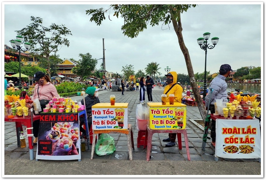走過『會安橋』,夜市小販也開始出來擺攤,最多的商品是現切水果、水果茶和冰淇淋,還有炸大隻魷魚腳及越式法國麵包等
