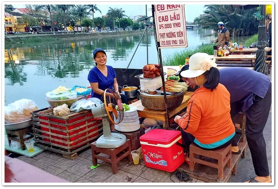 在『會安夜市』這一側的河岸邊,有整排的小吃攤,販售的是傳統會安美食,價格平民,還可佔據河岸第一排用餐,是來到會安一定要嚐試的美食體驗!