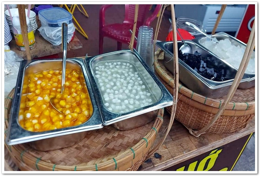 『會安夜市』有好多美食可以選擇,由於氣候炎熱的關係,涼飲冰品是最多人的選擇,像這一攤賣的是蕃薯圓、仙草、涼粿等等,都是遊客的最愛