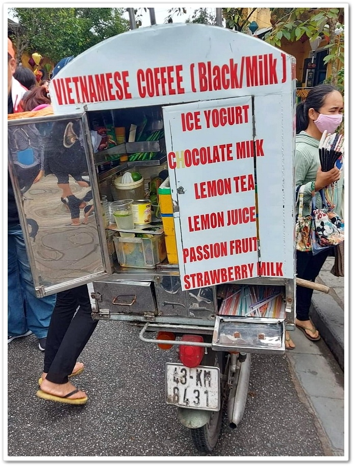 還有在越南常見用機車載運的攤子,不僅移動速度快,而且還能隨時隨地擺攤,就跟我們台灣4、50年代的芋仔冰小販一樣,但這一攤賣的是現榨檸檬汁,你看車內還有榨果汁機,所以保證新鮮,只是我現在上了年紀,對於有糖飲料總是敬謝不敏,喝了飲料醣份馬上標升,所以不太敢喝!