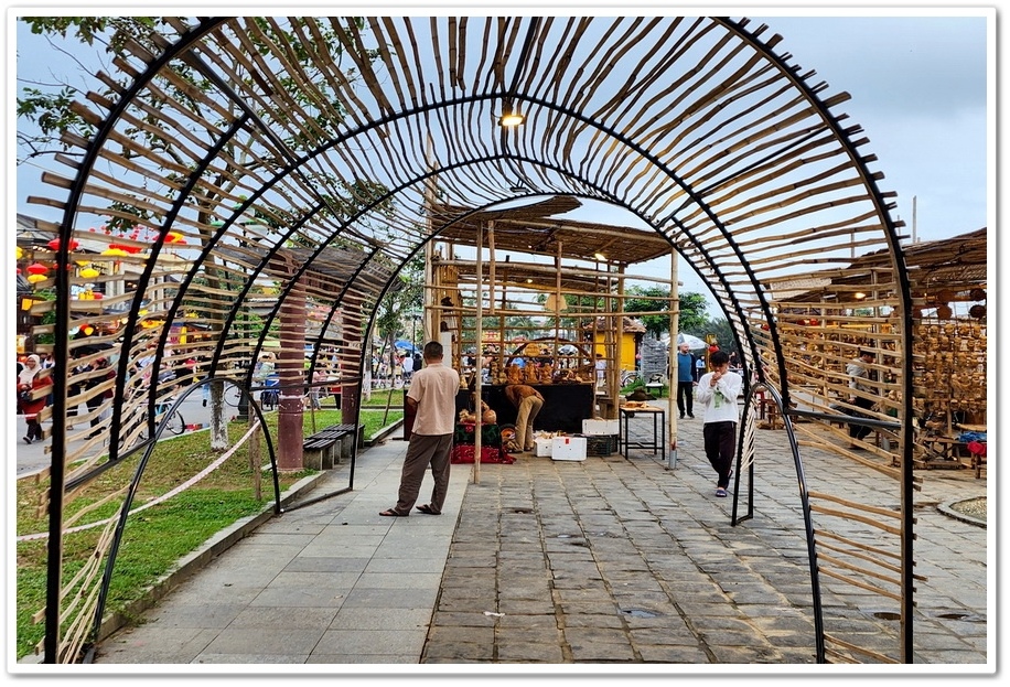 步行走過『會安橋』到古城對岸,每天晚上都會有夜市擺攤,除了小吃攤外,還有會安的道地小吃高樓麵、雞肉飯,還有很多當地紀念品或飾品的攤位,而重頭戲就是傳統的手製絲絹燈籠,店家擺出許多樣式各異的燈籠十分華麗,很多人會與燈籠拍照留念,店家基本上也不會阻止或排斥