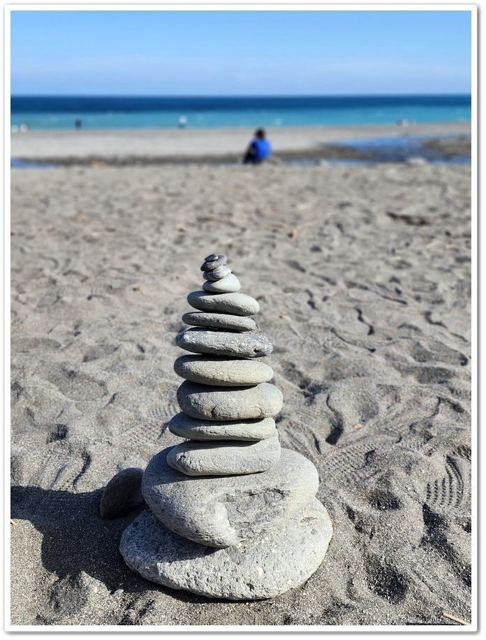 環顧四週除了無敵海景,療癒圓潤卵石組成一片礫灘,遠方壯麗山景在清晨雲煙繚繞,構成金崙獨樹一格富有仙氣的風景。在礫石灘上,少不了體驗堆疊卵石的樂趣,海灘上有不少遊客留下的作品,互相超越,彼此較勁。南迴公路上,村落旁的海灘,不分四季,不分日夜,總在人們心中留下美好回憶