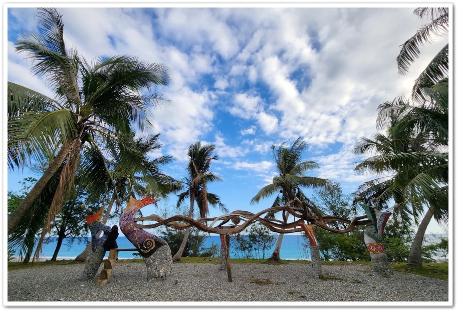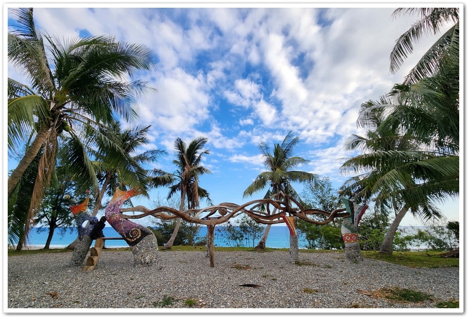 接著我們又循著台9線來到370公里處,這裡有一件南迴藝術季作品『陸發岸Ruvuwa'an.發芽』的作品,作者:饒愛琴+敲裂拼姬工班。以卑南族石生系統的故事為發想,並運用漂流木、石頭等自然素材,結合馬賽克拼貼創作方式,打造出這項作品。而『陸發岸』即是發芽、發祥地之意