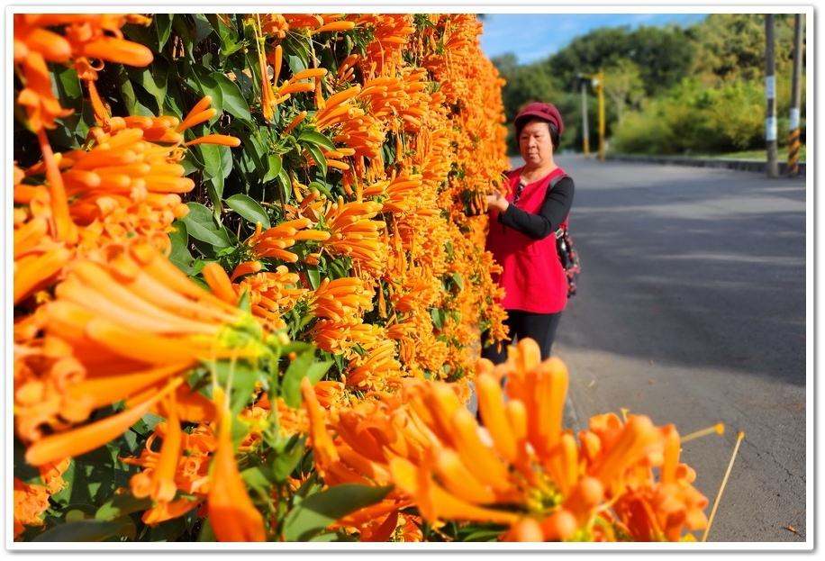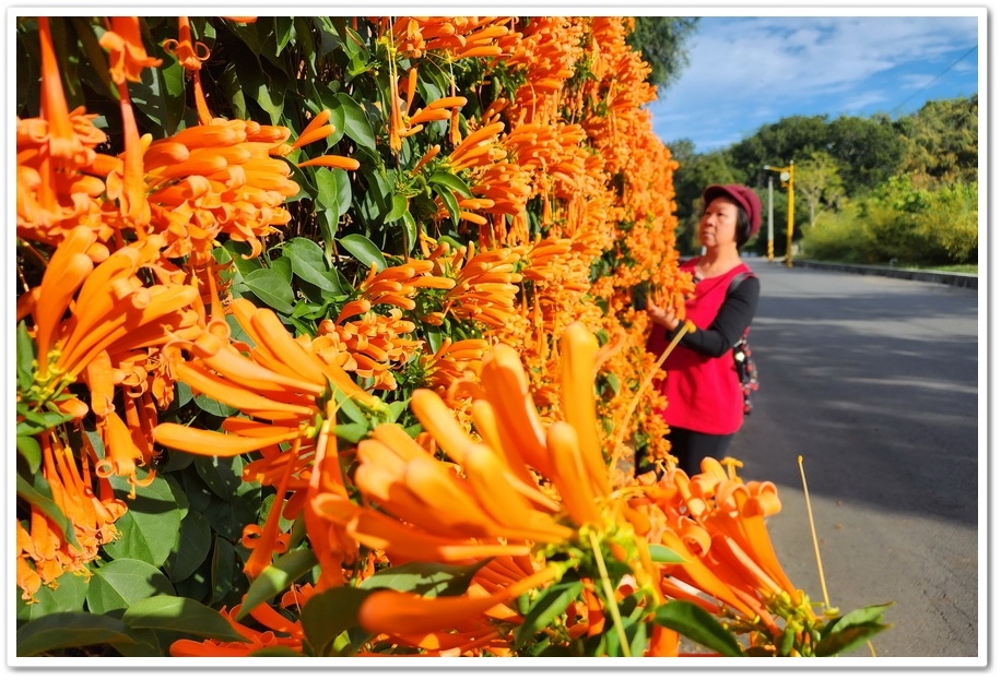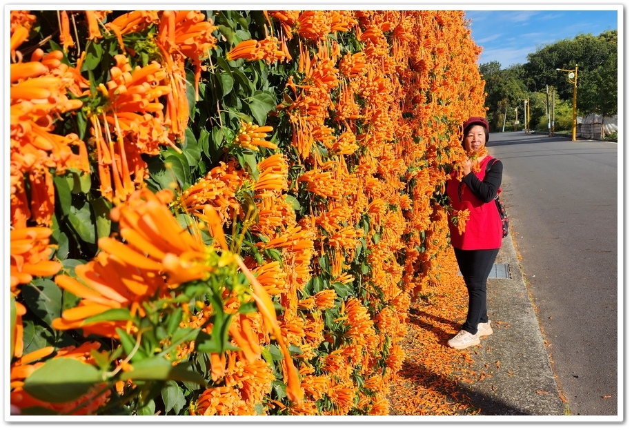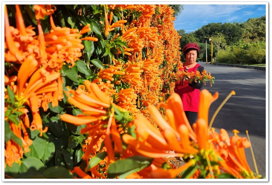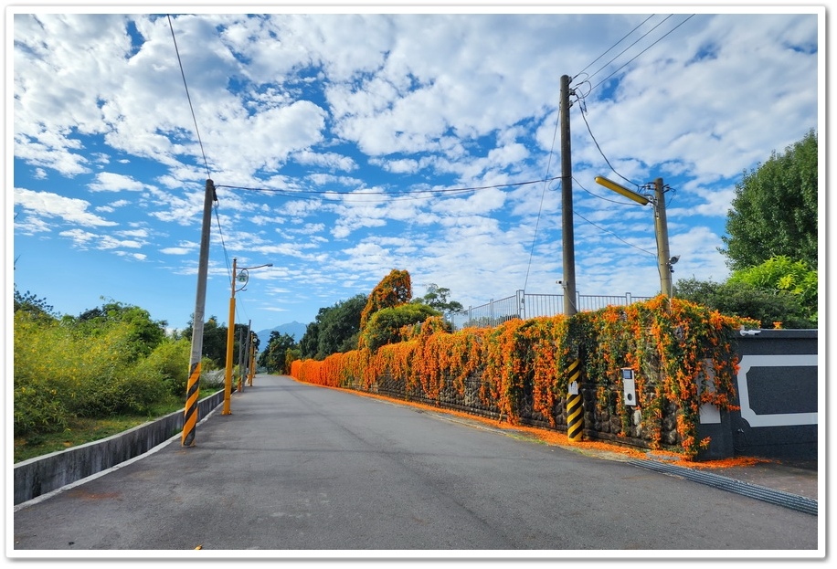 『岩山路』有大片炮仗花,但很少人知道這裡的炮仗花,炮仗花總長度約有250公尺,花牆下水溝有加蓋,而且『岩山路』人車稀少,整個拍照環境比苗栗銅鑼『環保公園』的炮仗花還要好,但就是只有在地人才知道的炮仗花美景