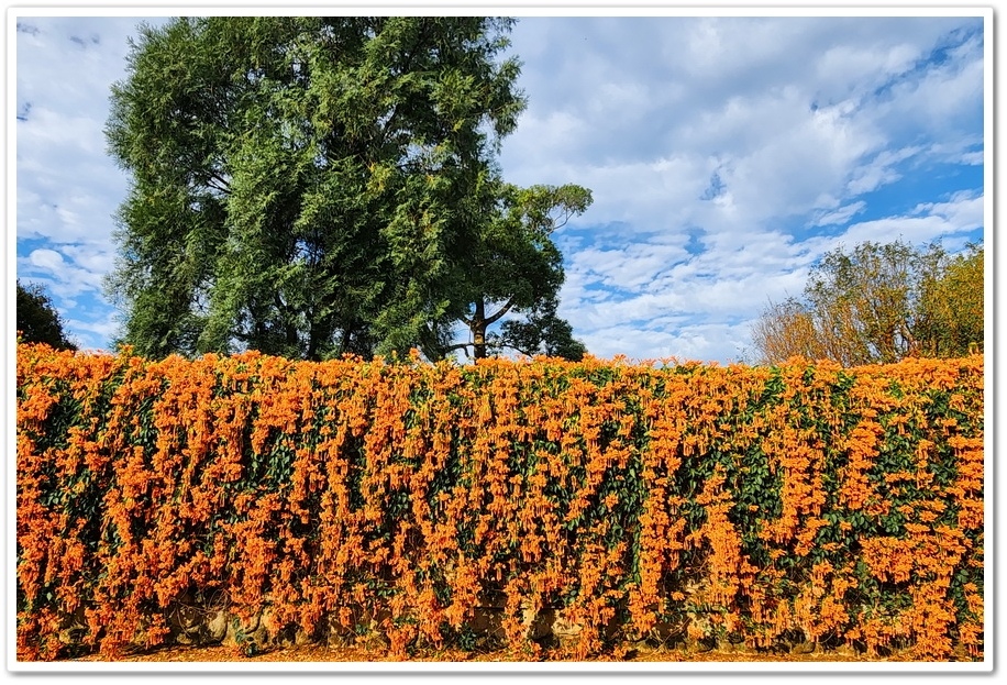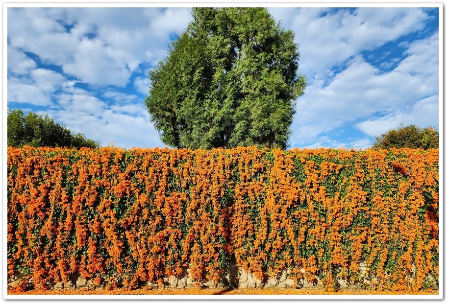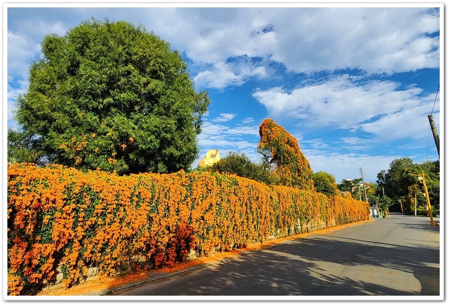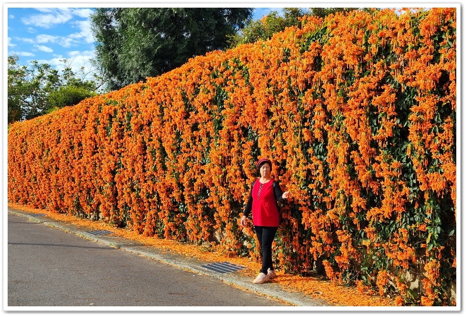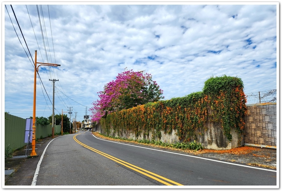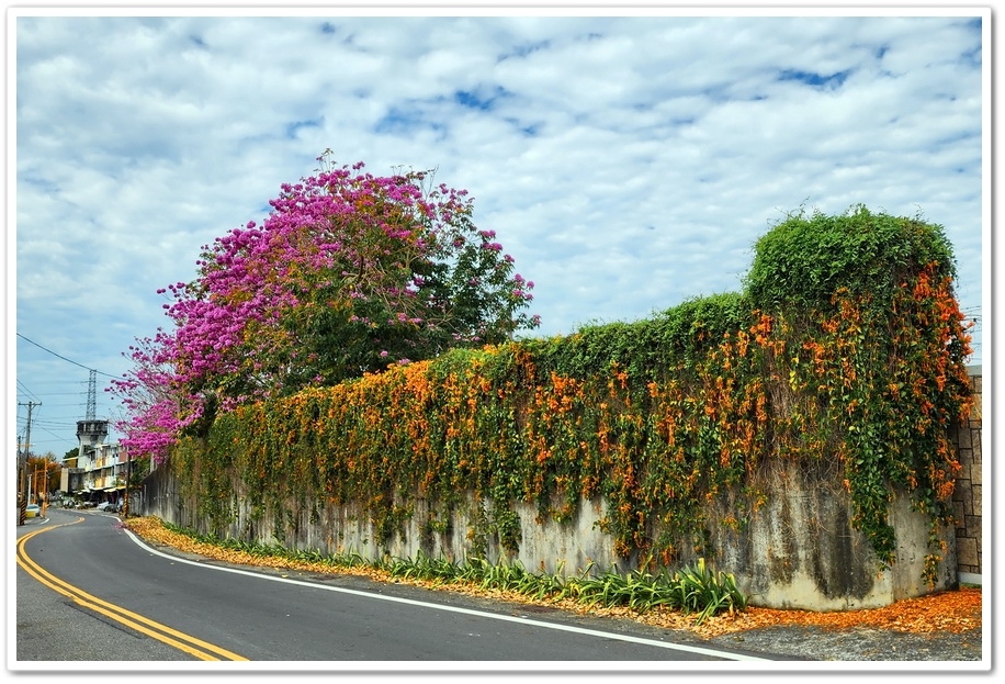 炮仗花牆位在『岩山路』,轉個彎就是『梅林路』,這裡有一座『新光部隊』的砲兵營區,是台灣專門代訓『新加坡』砲兵的營區,所以才叫做『新光部隊』,也很少看到營區樓房蓋得像別墅的,在國三264K處就可以見到此『新光部隊』的別墅型營區樓房