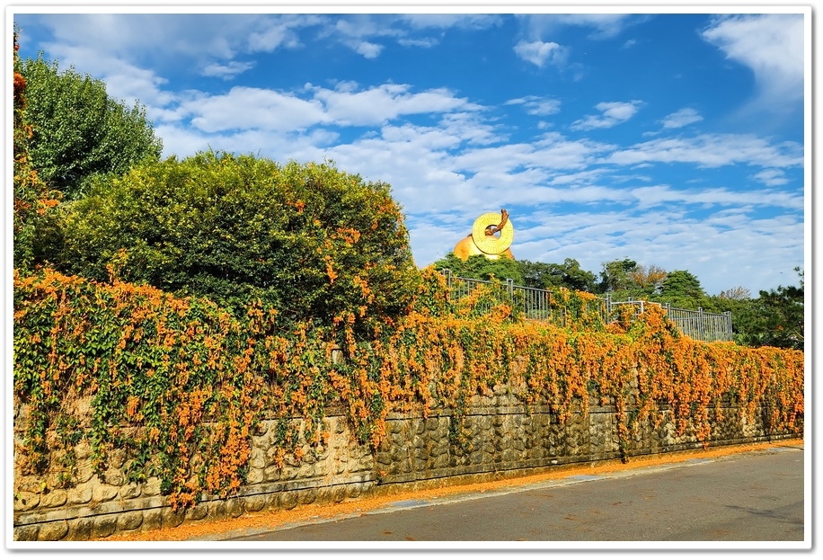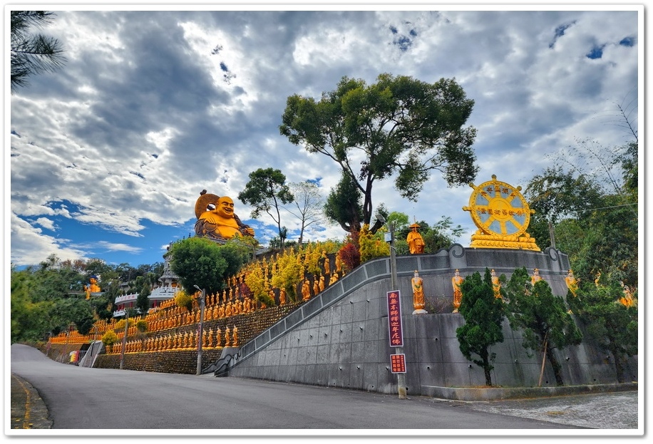 然後再轉個彎就是斗六『湖山岩寺』的彌勒佛,炮仗花海就在『彌勒佛』後方,『湖山岩寺』是雲林斗六著名寺廟,這裡開發成為佛教園區,佔地約十公頃左右的公園,除了道路兩旁林立的千佛雕塑外,尚有紫林羅漢山、琉璃世界、彌勒大佛像、佛教文化館等多種景觀設施