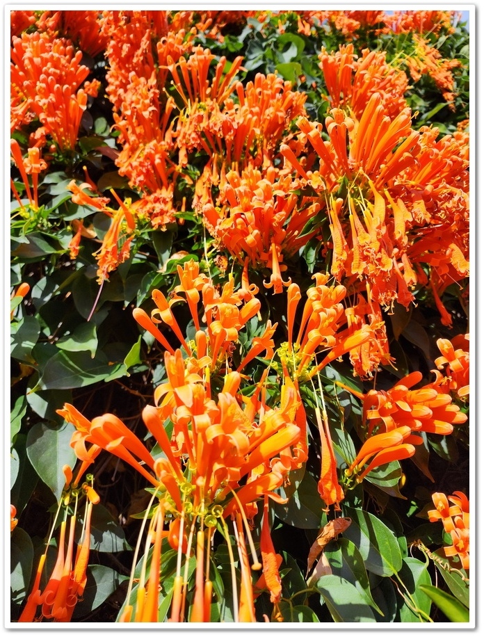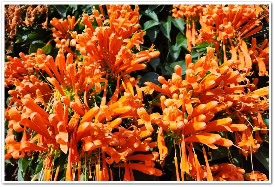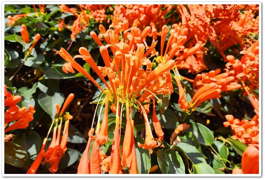 靜靜的在庭院裡的一處角落,花開與花謝總是在無聲無息中演化,繁忙街道上的行人匆匆的從花旁走過,不曾引起多少人注視的目光,但是炮仗花還是照樣與世無爭盡職的開起那美麗的花朵