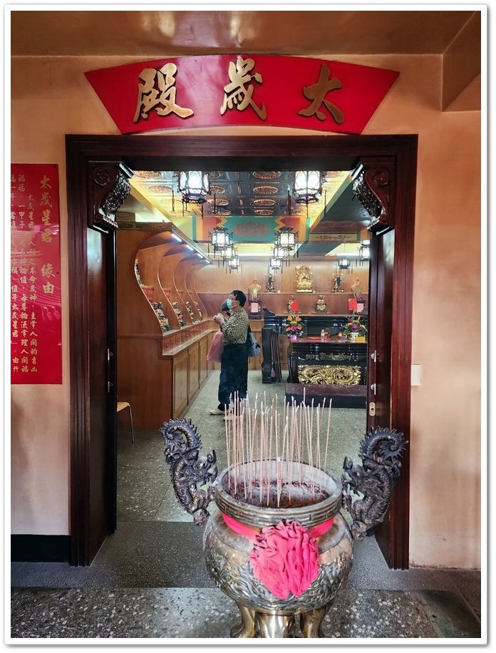 『太歲殿』奉祀斗姥元君,配祀左輔洞明星君、右弼隱光神君、六十太歲星君。 中國傳統紀年方法為干支紀年法,由十個天干(甲、乙、丙、丁、戊、己、庚、辛、壬、癸)和十二地支(子、丑、寅、卯、辰、已、午、未、申、酉、戌、亥)依次輪流搭配而成。始於甲子,終於癸亥,一個輪回需六十年。太歲又稱「太歲星君」,為人類之本命歲神,主掌人間的吉凶禍福