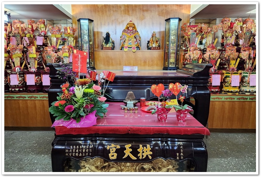 安奉於神房前有稱為『黑面二媽』與『粉面三媽』的兩尊神像,前者負責每年遊庄,後者則在該地居民家中辦喜事、聖誕或是鄰近宮廟慶典時受邀作客。像是2018年2月13日,由『三媽神轎』帶領信眾踏上『拱天宮』聯絡道(拱天路)作祈福