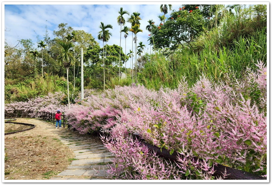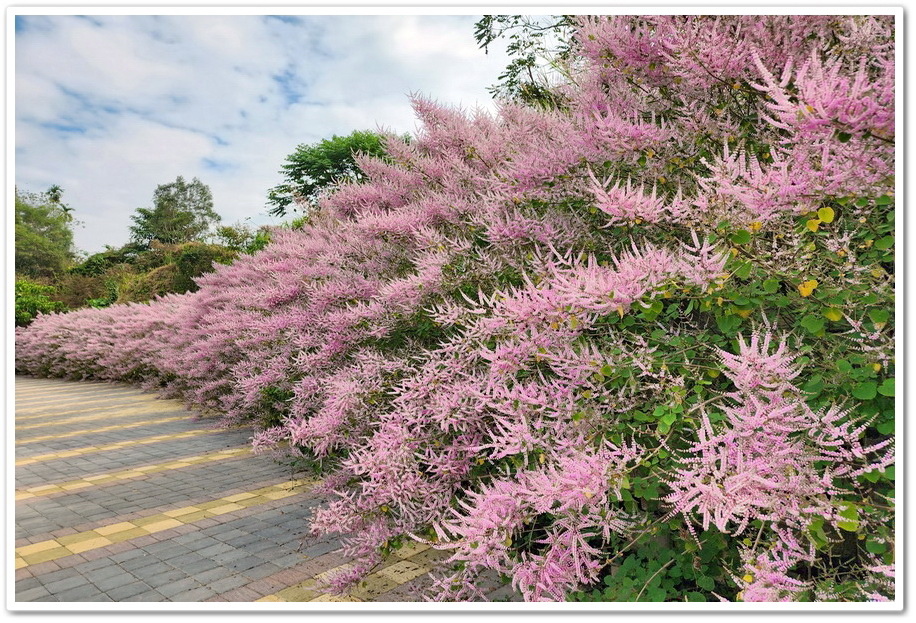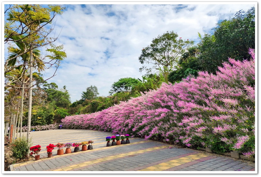 整個花牆完全不輸給中寮的『粉紅山丘』,整個花牆一路綿延,看起來像是完全沒有盡頭一樣!早早就有消息靈通的遊客搶拍一波。由於花牆前的走道相當寬敞,因此完全不用擔心人擠人,甚至可以輕鬆拍到極具延伸感的美景!直接將兩百多公尺的花牆盡收!