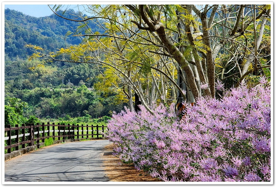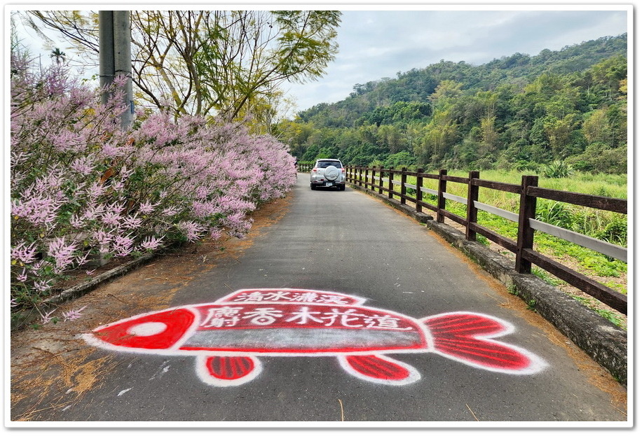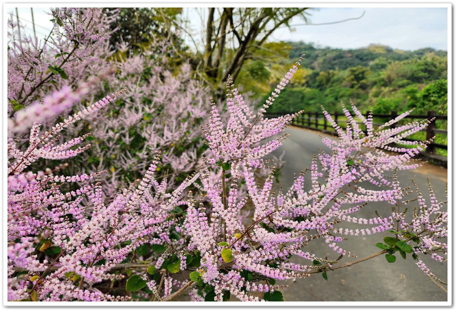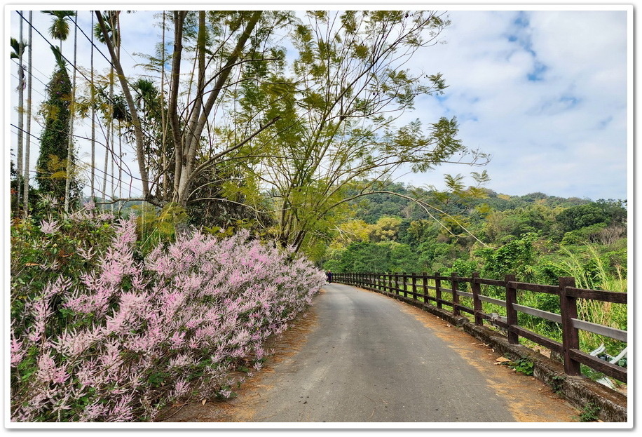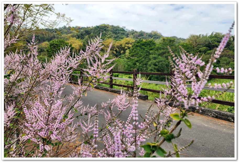 接著我們再開車往前走,經過上圖這座橋樑後右轉,這裡就是網有所說的『清水溝溪麝香木花道』,從橋樑起算到『榮生公園』約有600公尺長的『麝香木花道』,景致不同於前段的『麝香木花道』,但各有不同的美