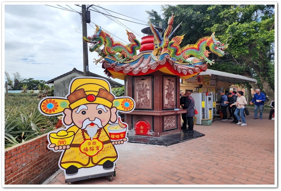 『福榕宮』位於彰化縣芬園鄉139線道上,旁邊是一處廣大的鳳梨田,廟方為單車族貼心準備泡麵,讓大家填飽肚子再上路,經媒體披露『土地公請吃泡麵』後爆紅,春節獲信眾熱捐4千多箱、超過5萬碗,爆滿遊客聚集在百年榕樹下泡麵『呷免驚』,春節短短7天嗑掉6萬碗,差點供不應求,廟方緊急從香油錢提撥買泡麵應急