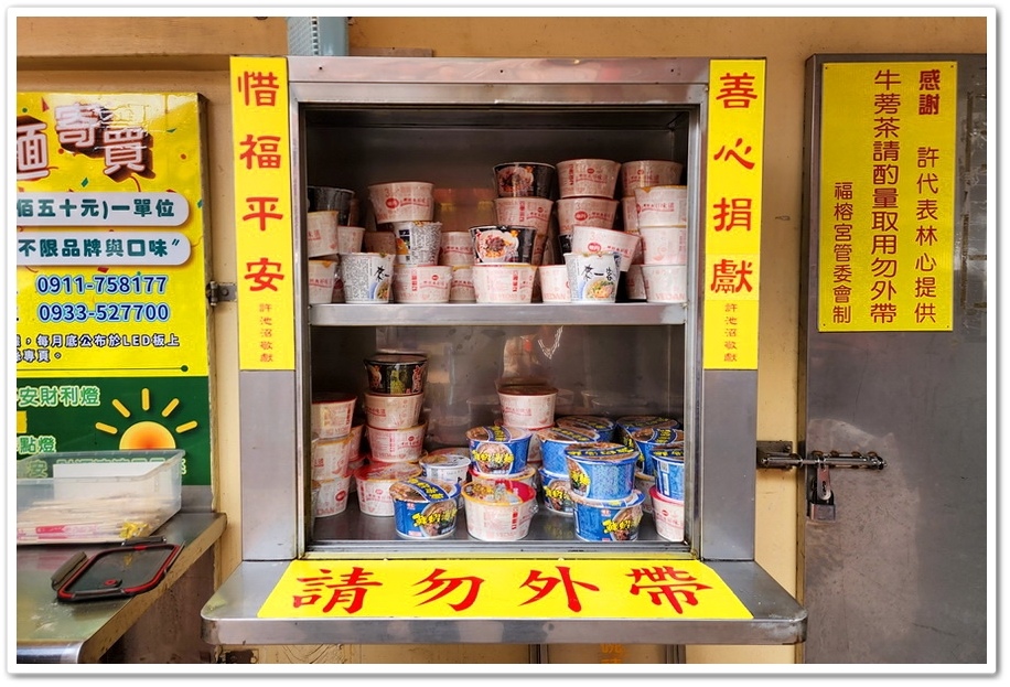 其實『福榕宮』的泡麵品牌或口味不多,大約只有4、5種泡麵口味,選擇性不多,但請勿浪費,吃多少、泡多少,吃得完為原則,善心人士捐贈,需惜福才能平安!也請勿外帶,讓大家同享土地公的福氣