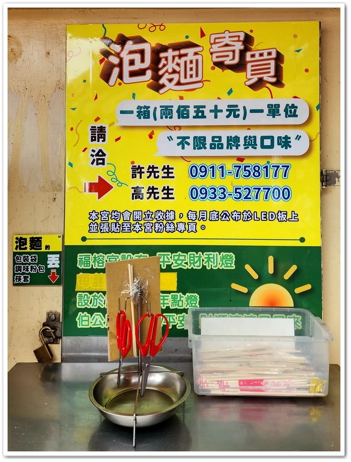 這裡有筷子和剪刀供泡麵使用,泡麵包裝袋、調味粉包塑膠紙、筷子包裝紙請丟入垃圾桶,以免造成環境髒亂,然後想寄買泡麵的信眾,這裡有資訊可能看一下!