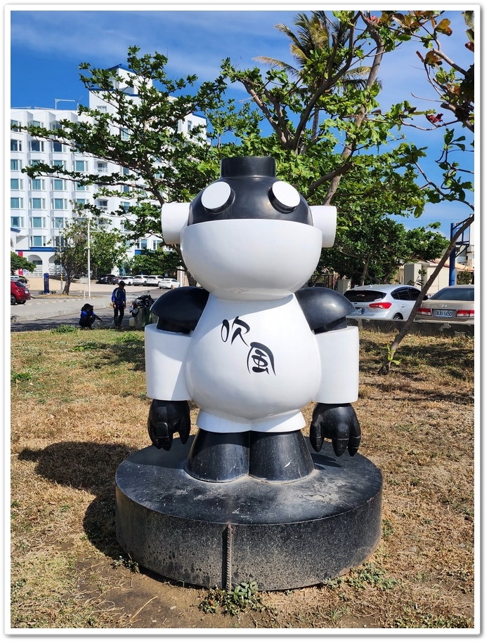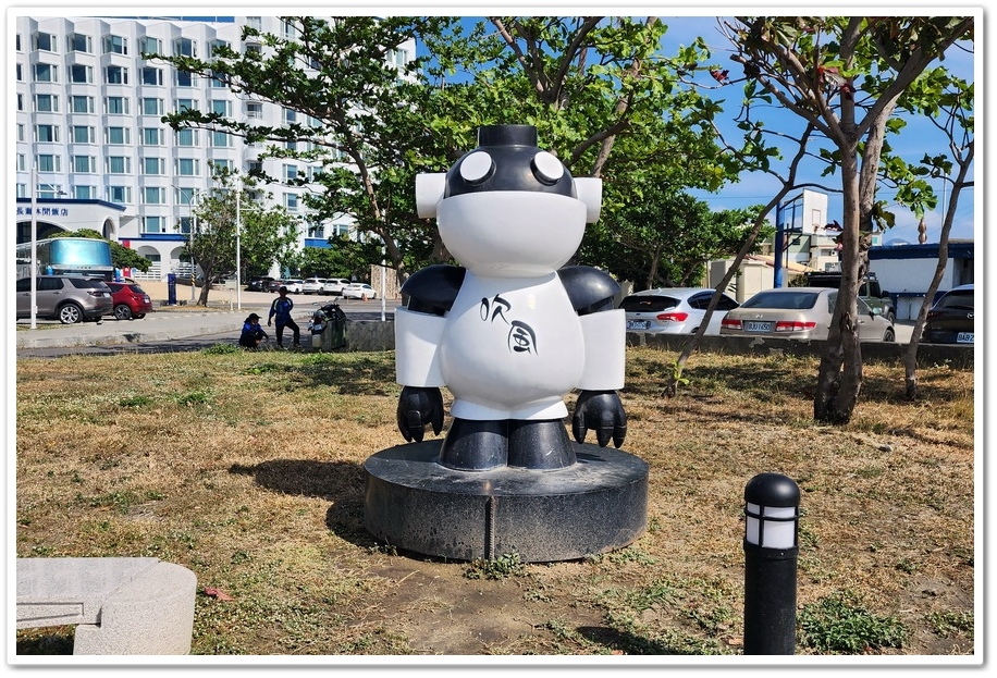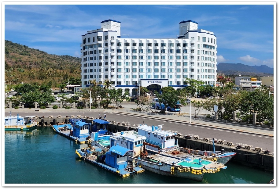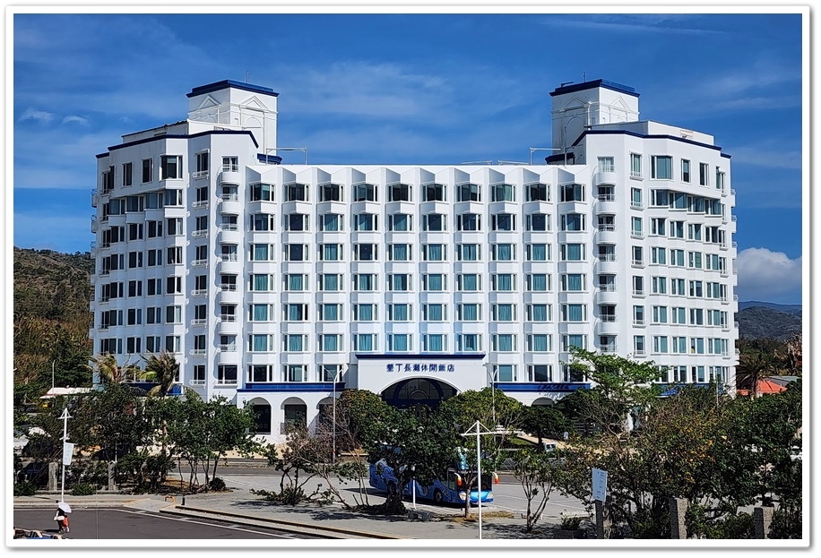 在『看海美術館』樓上看過去這一棟白色建築是『墾丁長灘休閒飯店』,是一家2021年全新整修開幕的海景飯店,飯店前方是一座車城漁港,以及一座乾淨遼闊的海景沙灘,在每一年都秋季時,屏東縣政府會定期舉辦『落山風藝術季』,吸引遊客前往踏沙並欣賞創作者的藝術展覽