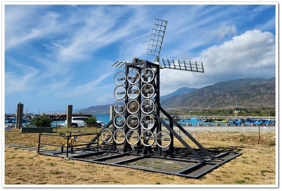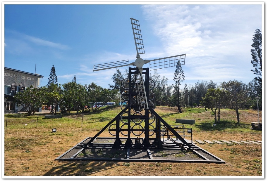 ▲ 風車輪Wind Wheel。藝術家:東弘一郎。《老人與海》中的主角與不斷變化的自然力量角力,而『風車輪』以屏東廢棄的Pbike輪胎做成的一座風車,運用風力轉動,意味著接納屏東的風而因其轉動的作品;兩者都不試圖對抗自然力量,而是嘗試理解後而有所行動。風的力量與方向難以預測,作品將透過風創造出一座如遊樂場的空間,從視覺上展示如何與多變的大自然互動
