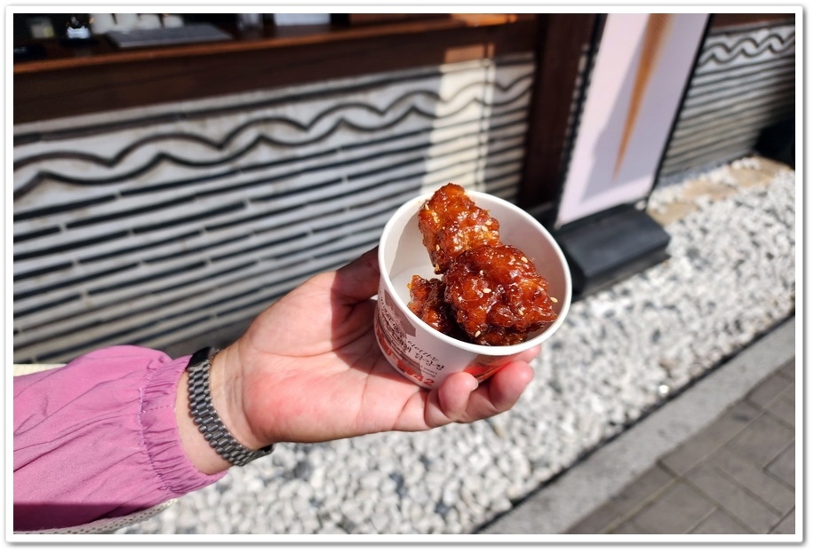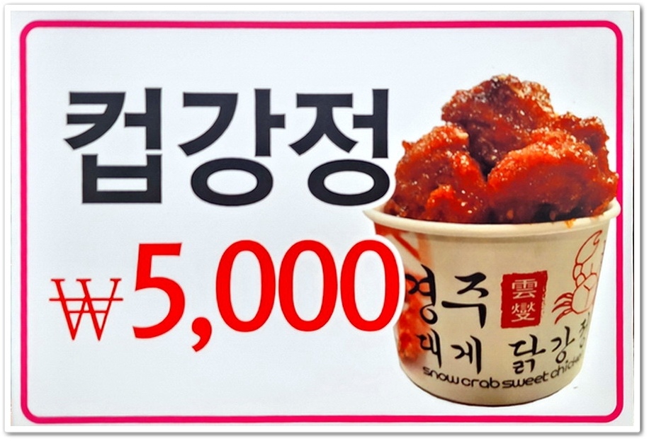 ▲ 看到圖片的時候,我以為裡面是一口蟹,因為跟台灣的一口蟹很像,我問店員這是不是一口蟹?但是店員聽不懂我說什麼?我也聽不懂店員說什麼?兩個人雞同鴨講,還好旁邊有一位店員會說中文,才知這是『蜂蜜韓式炸雞』,這一盒炸雞5000韓元,約等於台幣120元,不過吃起來甜大於鹹